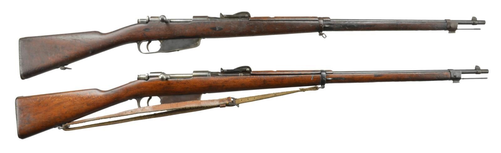 RIFLES BY TERNI. ALL: Cal. 6.5 Carc. (6.5x52mm). Bbls. 30.6" w/ oct. shanks, blade front sights & 2000m tangent rear sights. Cock on open Mannlicher actions use 6 rd. magazine clips. No visible import marks. Wooden stock & handguards.