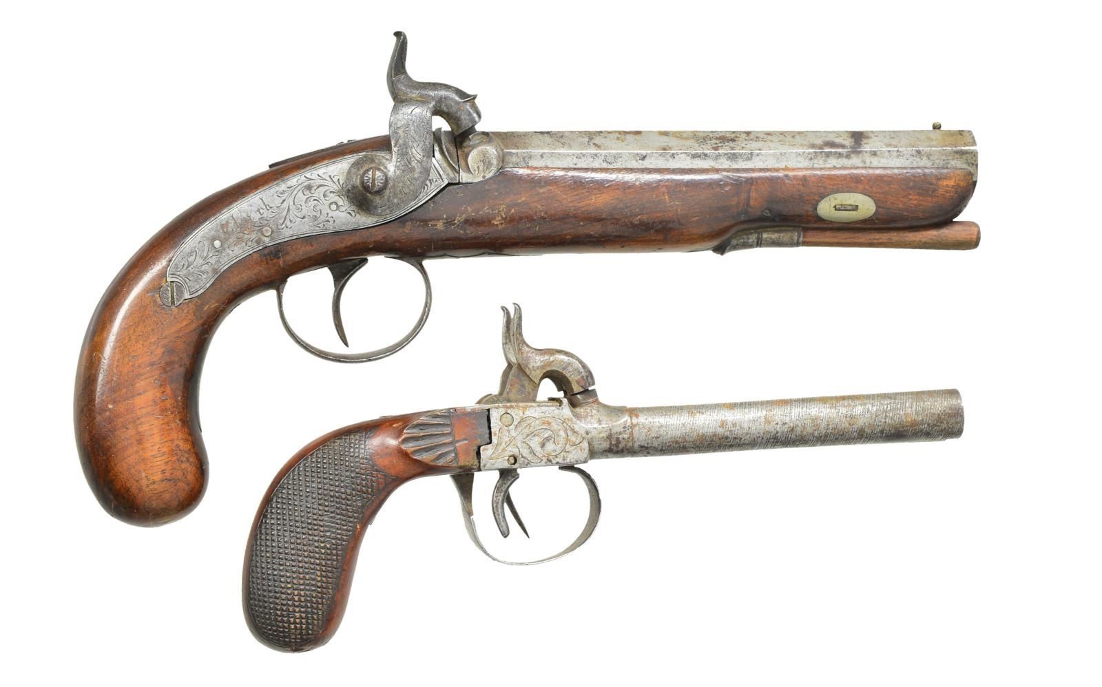 1) Cal. about 45. NSN. Bbl. 6" oct. w/ smooth bore & brass bead sight. Breech end of bbl. has 2 platinum bands w/ highlights of engraving. Top flat has electric pencil marking "Memphis". Left flat has apparent Birmingham proof marks & is engraved "Cluch". Wedge fastened rnd. butt walnut stock w/ engraved iron trigger guard & trigger plate. German silver wedge escutcheons & oval name plate at wrist. Hardwood ramrod held by faceted thimble. CONDITION: metal has faded to gray showing scattered pitting & surface corrosion. Stock has worn finish showing numerous scratches & marks. Lock will not hold in full cock position & will drop from half cock position. Pitted bore. Belgium box lock sxs pistol.