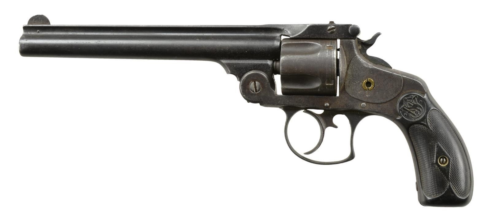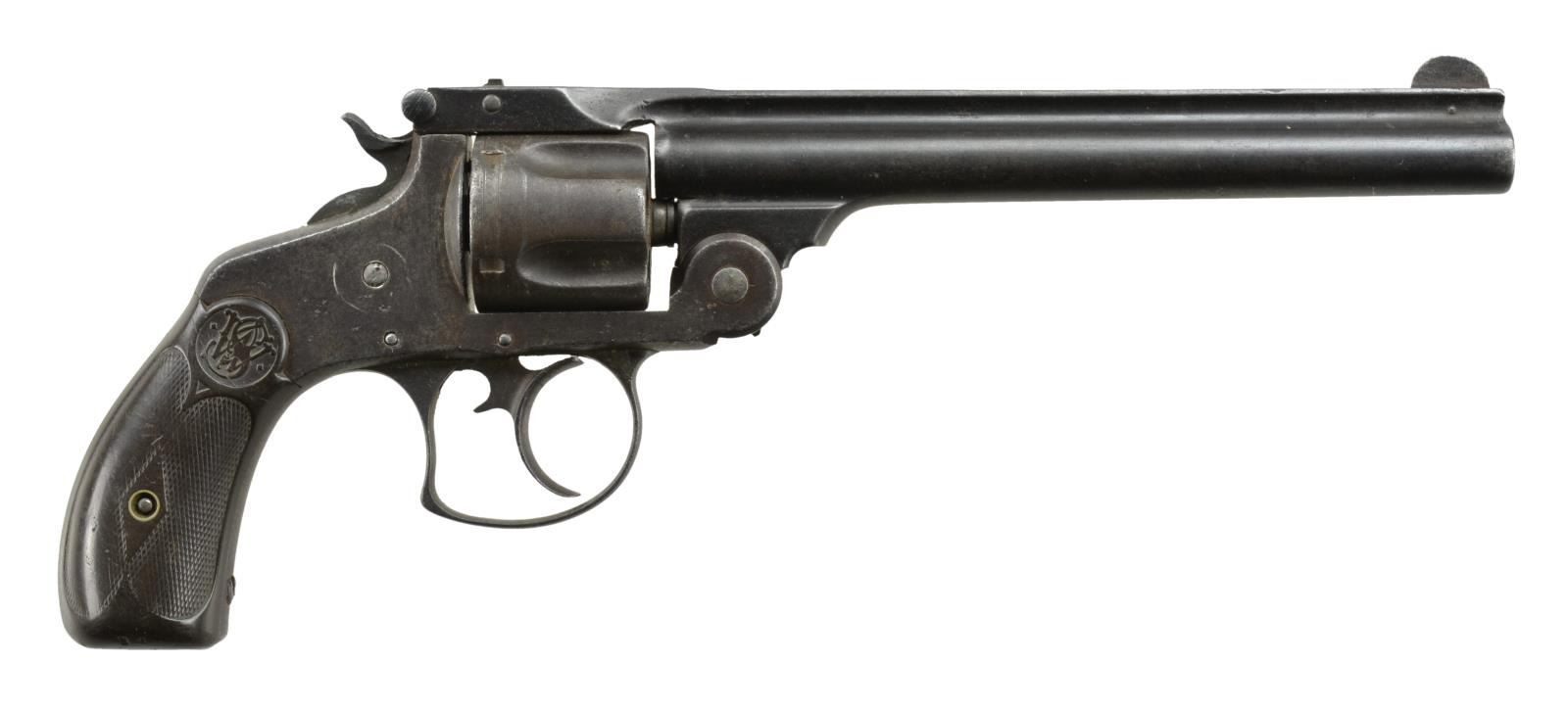 1) S&W .38 DOUBLE ACTION. S# 67827. Bbl. 6" w/ pinned blade sight plus notched barrel latch rear. Mfg. 1880-1884 as 2nd model w/in S# range of 4001-119000. Checkered logo hard rubber grips. Cyl. numbered 30678, bbl. latch numbered 96482; bbl. number not readable. CONDITION: poor to fair overall as assembled from parts. Replacement brass nut on side plate. Replacement firing pin rivet. Patina appearance throughout. Worn but undamaged grips. Fair bore w/ worn rifling & noticeable pitting. Loose (unsafe to shoot) latching & grossly out of time. (01-21141/NW).