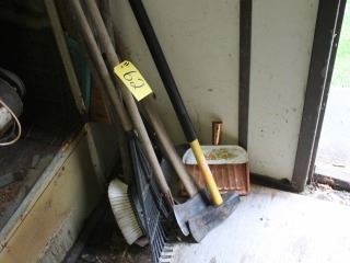 2 AXES, RAKE, DUST PAN, GARDEN HOE, BRUSH