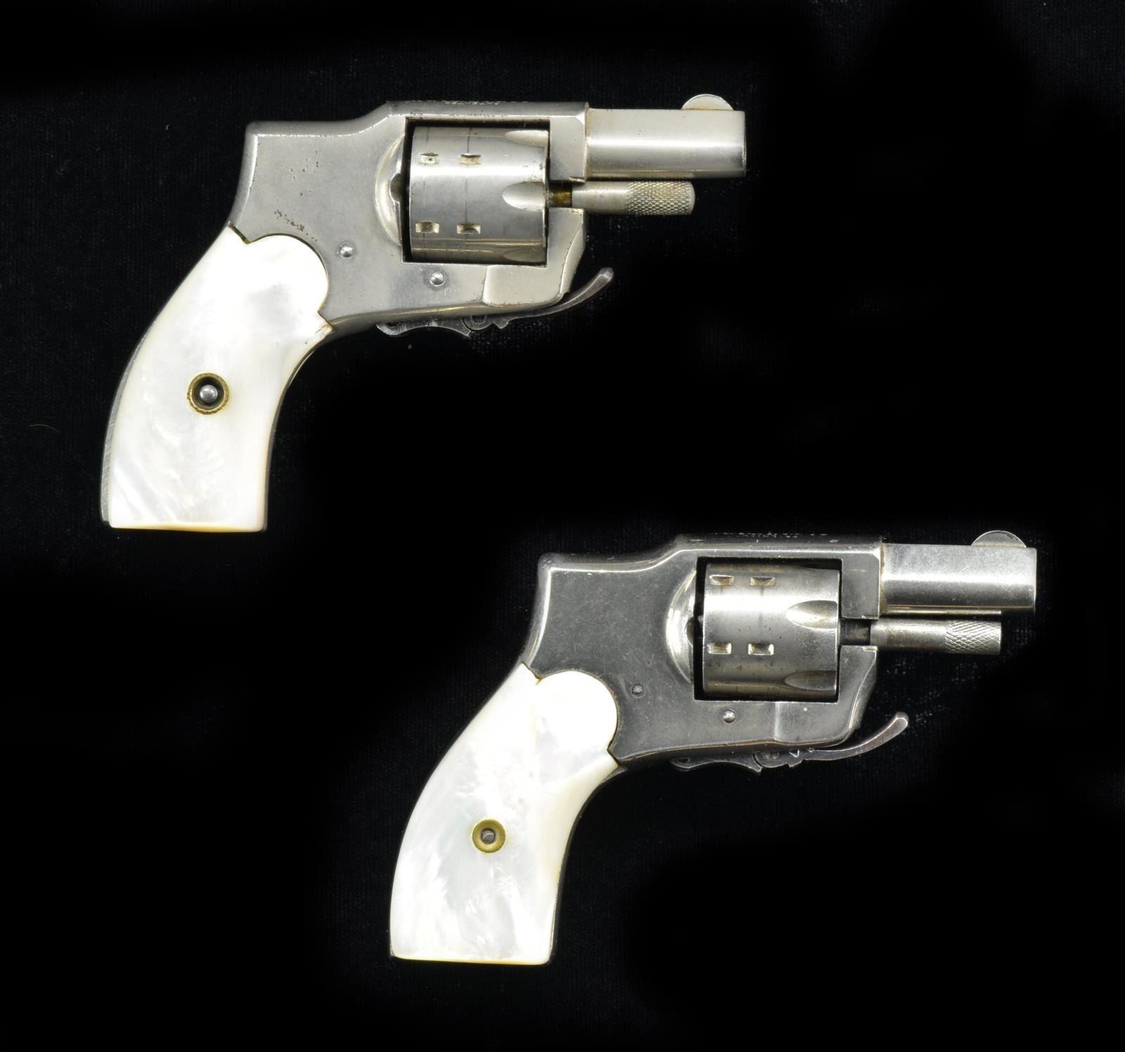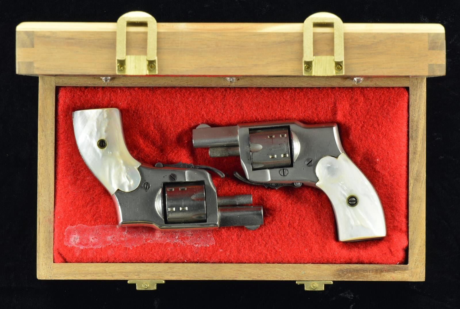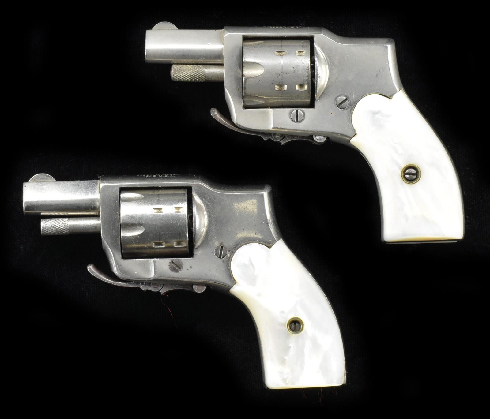 BOTH: Cal. 22 RF. Bbls. 1 1/4" teardrop shaped w/ blade sight. Mfg. 1924 (1916-1938) in Philadelphia; dated on top straps along w/ "EJECTOR MODEL". Nickel plated w/ square butts having pearl grips. Distinguished by shape & easy side removal of semi-fluted, double notch cyls.; hard rubber grip models had "S" logos. Cyls. have spring loaded ejector rods for retention allowing easy side removal plus all 6 cartridges can be ejected at once; hence the name "EJECTOR". Best for 22 Short RF but Longs will fit if overall length less than cyl. UNATTACHED ACCESSORIES: very good, well made cedar box w/ padded red interior. CONDITION: overall appearances are very good w/ bores having even light pitting. Both would benefit from application of fine metal polish. PROVENANCE: Estate Collection of Kenneth Horn (Grandson of JC Higgins).
