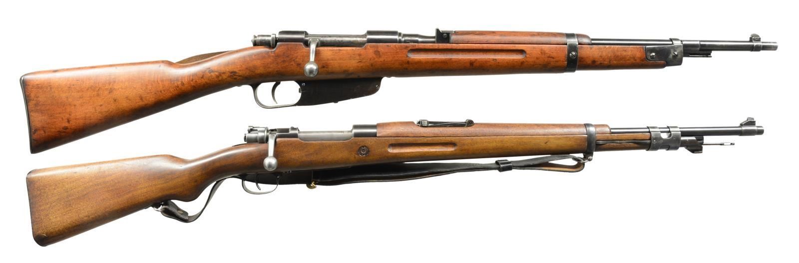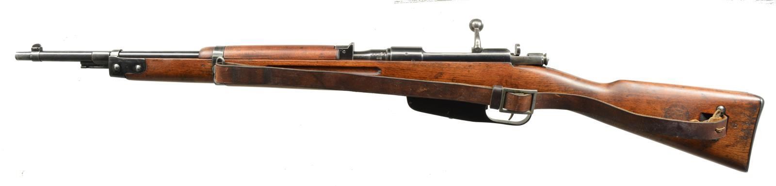 1) MODEL 1938 CARCANO RIFLE. Cal. 7.35 Italian. S# S2332. Bbl. 21". Bbl. is marked on top of chamber w/ crown, “R-E” & “TERNI”. Marked on left side w/ crossed rifles, indicating weapon of above average accuracy. Marked on right side w/ “1939” & “XVIII”. Fixed open rear sight marked on top w/ “CAL. 7.35”. Blade front sight. Turned town bolt handle. Bayonet lug is present. Provision for side sling. Trap buttplate. Hardwood stock set. Vintage leather carrying strap w/ rawhide laced attachment. CONDITION: stock set has arsenal rework finish, nearly making markings almost illegible. Metal retains 60% original blue w/ thinning & light wear. Very good, shiny bore. (20-1993/RW). 2) MODEL 1943 SPANISH MAUSER. Cal. 8x57 Mauser. S# 2G-4415. Bbl. 23 1/2". Receiver is marked on top w/ “FABRICA DE ARMAS”, Spanish crest, “LA CORUNA” & “1954”. Mismatched numbers throughout. Turned down bolt handle. Tangent rear sight graduated to 2000m. Inverted V front sight. Cleaning rod is present. Bayonet adapter to accept earlier M93 type bayonets. All milled furniture has bottom & side swivels. Vintage leather carrying strap. Walnut stock set. CONDITION: stock has arsenal rework type finish w/ slight loss of wood. Light wear, staining & handling marks. Sm. crack behind trigger guard tang. Metal retains 50% original finish w/ thinning & wear due to arsenal cleaning. Very good, shiny bore. (20-1994/RW). BOTH CURIO. $500-900.