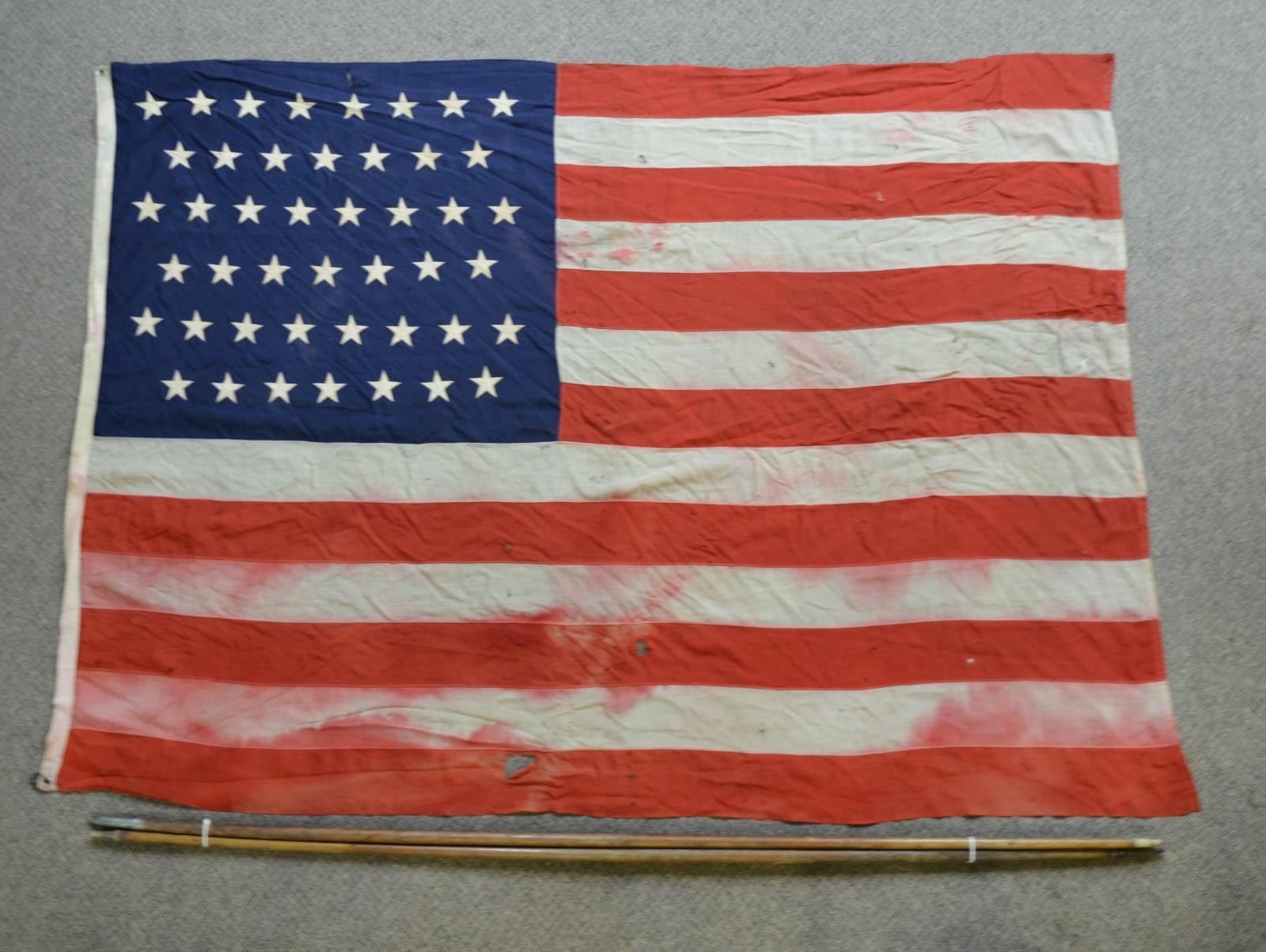 2 Approx. 83" flag poles w/ 1 missing metal points. / 45 Star US Flag as used from 1896 to 1908. CONDITION: poles in good intact condition. Flag in fair condition w/ many holes & staining. (02-16860/MD). $200-400.