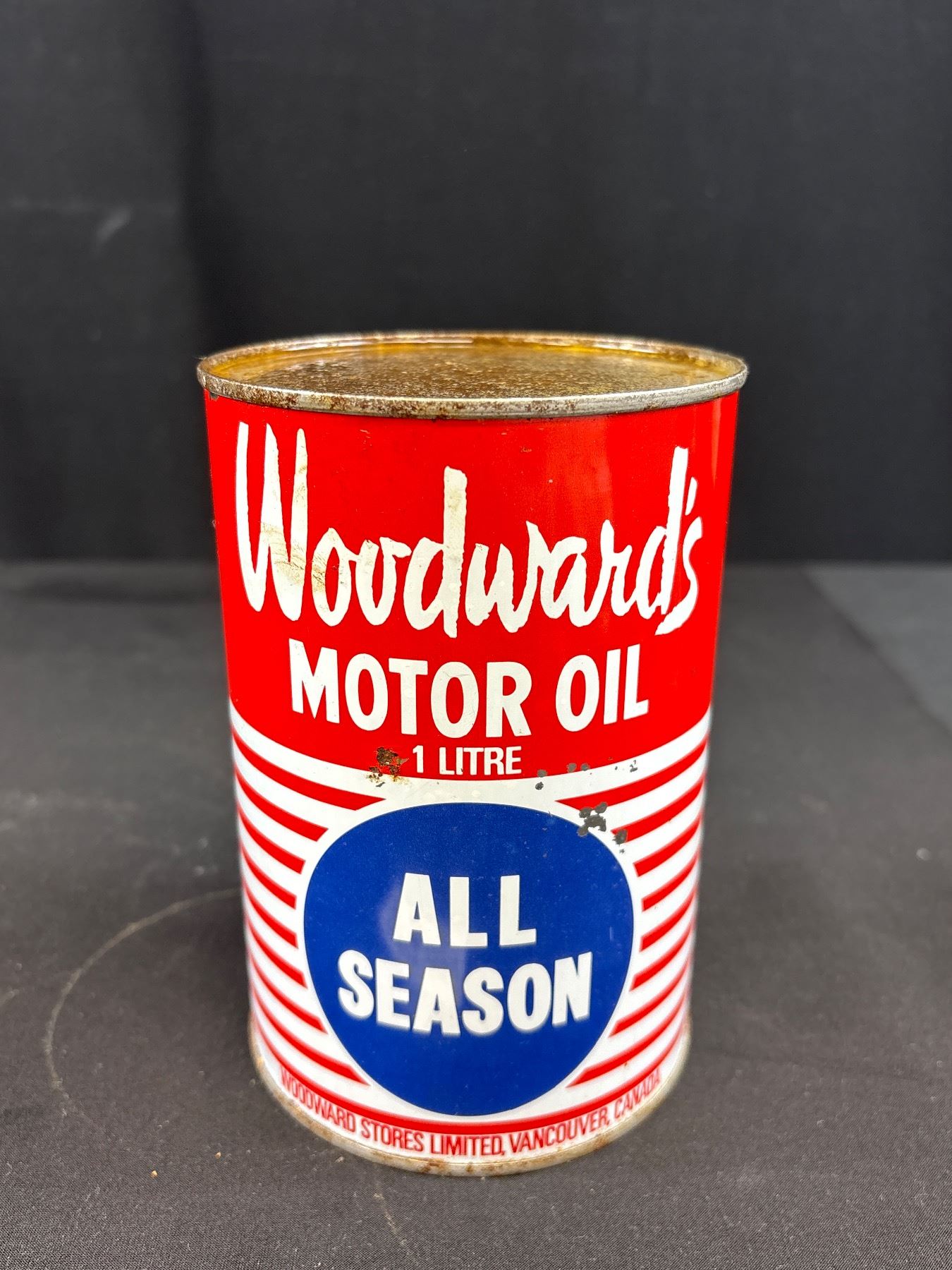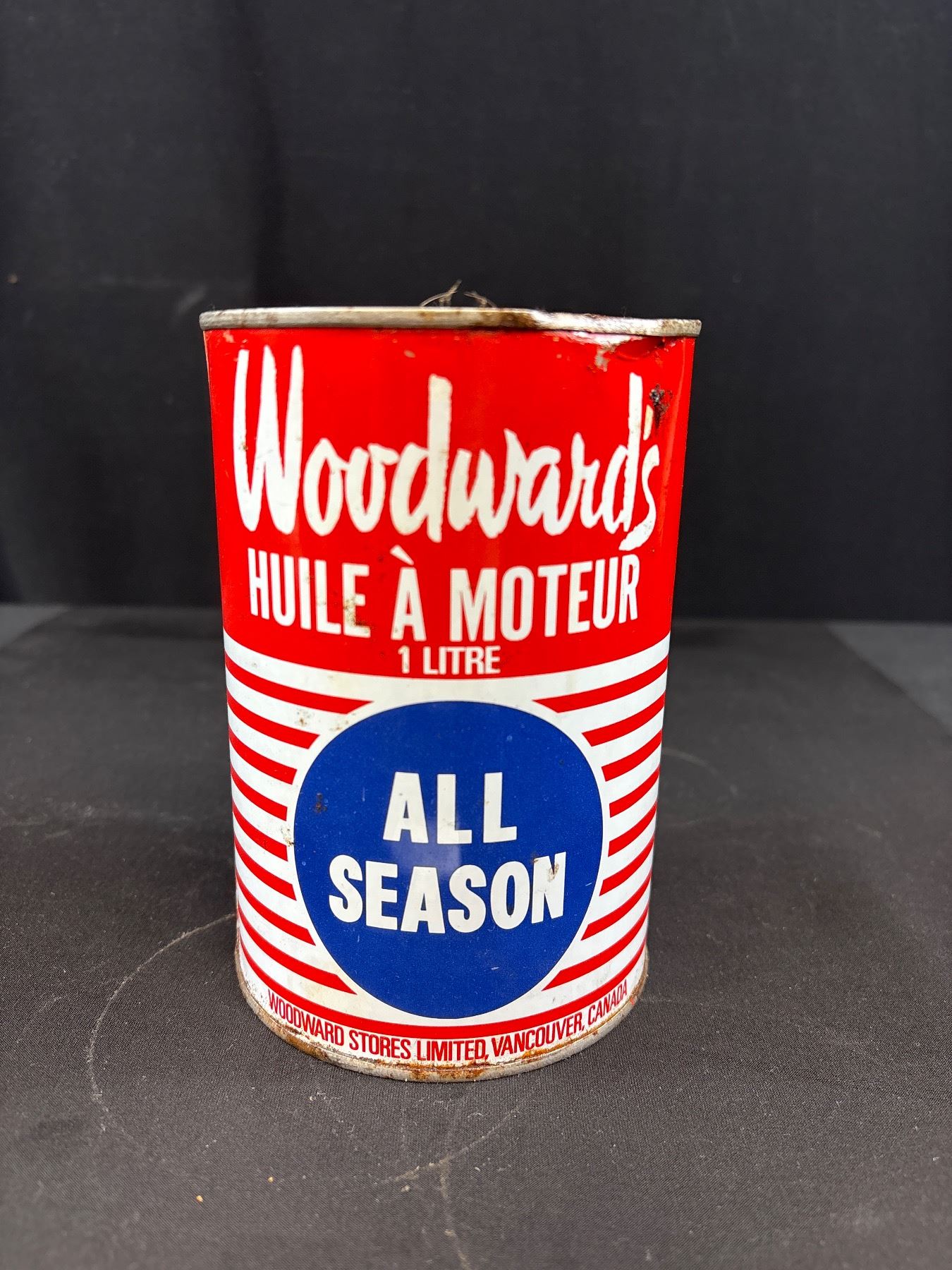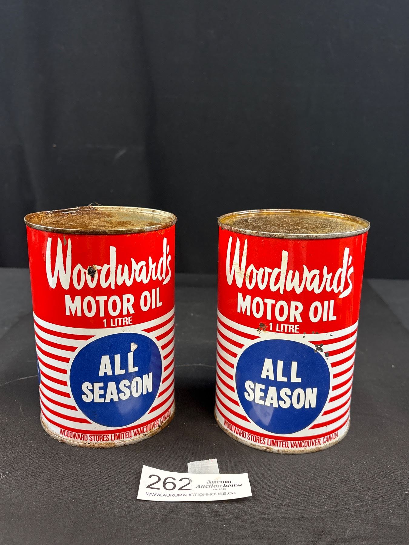 2 Full Woodwards All Season Motor Oil Tins Pin Holes on Top