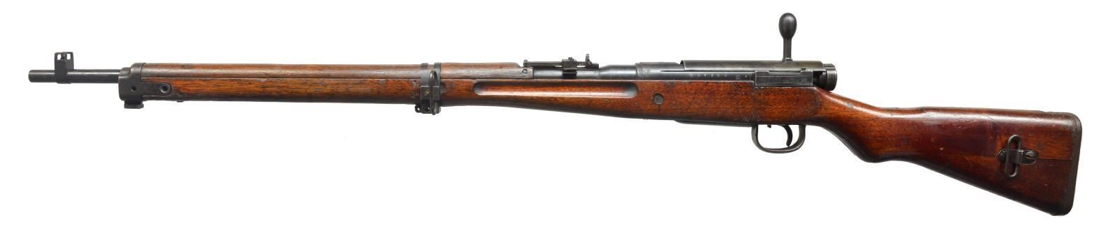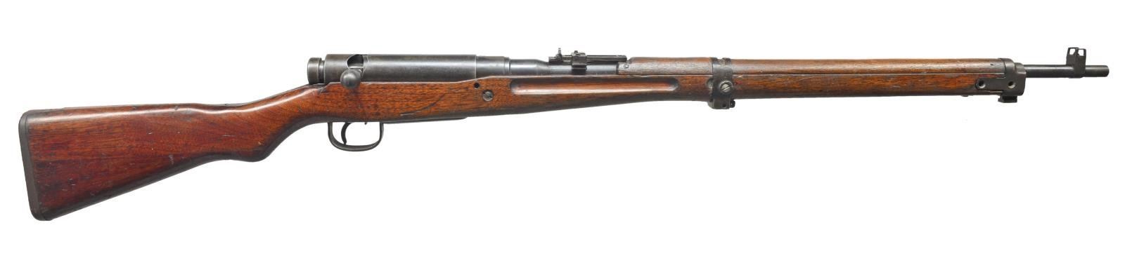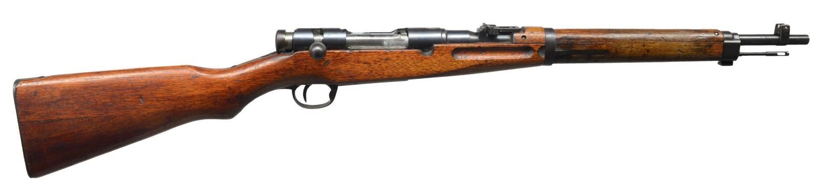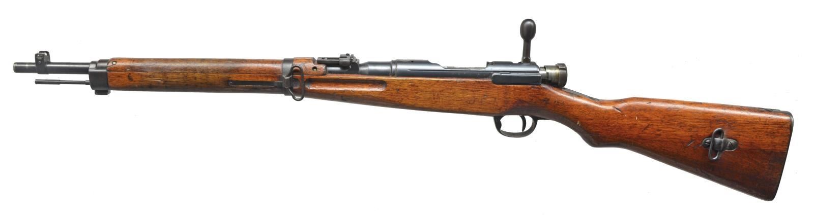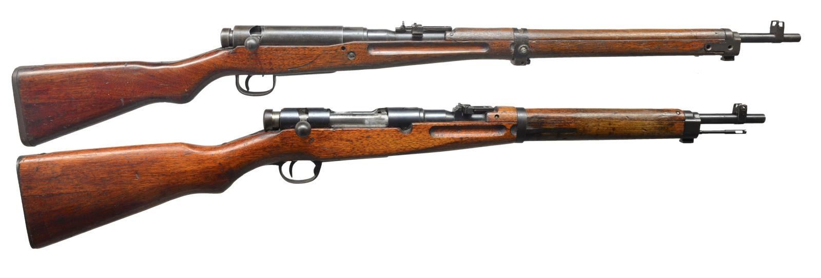 1) JAPANESE TYPE 99. Cal. 7.7 Jap. S# 91204. Bbl. 25 1/2". Receiver marked on left rail w/ Kokura Arsenal marking. Mum has been ground leaving Type 99 characters. S# matches on receiver & bayonet lug. Replacement bolt assembly & dust cover have matching number 776. Ladder aperture rear sight graduating to 1500m. Anti-aircraft wings are not present. Inverted V front sight w/ protective ears. Bolt handle has oval knob, Checkered notched safety knob. Cleaning rod is not present. 3-Screw upper band, screws are not present. Mono pod is not present. Lower band retaining screw is modern replacement. Small recoil bolt. 2-Screw butt swivel. Cup type buttplate. Hard wood stock set. CONDITION: original finish stock set has wear, dents, staining & scratches commensurate w/ extensive service use. Metal retains 75% original blue w/ thinning, wear & scattered spots of light oxidation. Bore turning dark w/ scattered spots of pitting. (20-3008/RW). 2) TYPE 38 CARBINE. Cal. 6.5 Jap. S# 4964. Bbl. 19". Receiver marked on left rail w/ Koishikawa Arsenal marking. Mum has been ground leaving Type 38 characters. Ladder rear sight graduated to 2000m. Inverted V front sight w/ protective ears. Oval bolt knob. Sm. tang checkered safety knob. S# match on receiver, bolt & upper band. Cleaning rod is present. Side sling. Hard wood stock set. CONDITION: original finish stock set has moderate wear, staining & scratches throughout. Metal retains 75% original blue w/ thinning, light wear & scattered sm. spots of oxidation. Good shiny bore. (20-3009/RW). ALL CURIO. $800-1,200.