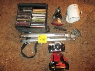 2 LIGHTS, ASSORTED MUSIC CD'S IN CASE, CAMERA C/W CASE & TRIPOD (PRACTIKA)