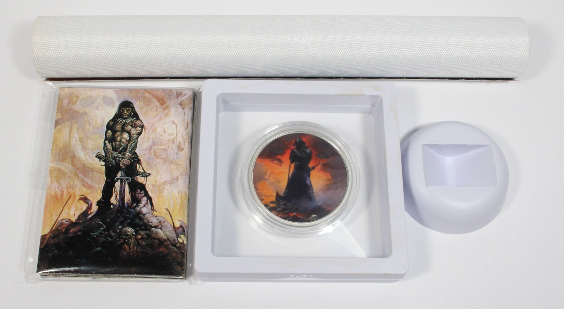 COLOURIZED. LARGE 47MM IN AIR TIGHT DIRECT FIT CAPSULE. IN FLOATING DISPLAY CASE WITH STAND AND 9'' X 11'' CANVAS POSTER AND 17 VINTAGE FRANZETTA COLLECTOR CARDS