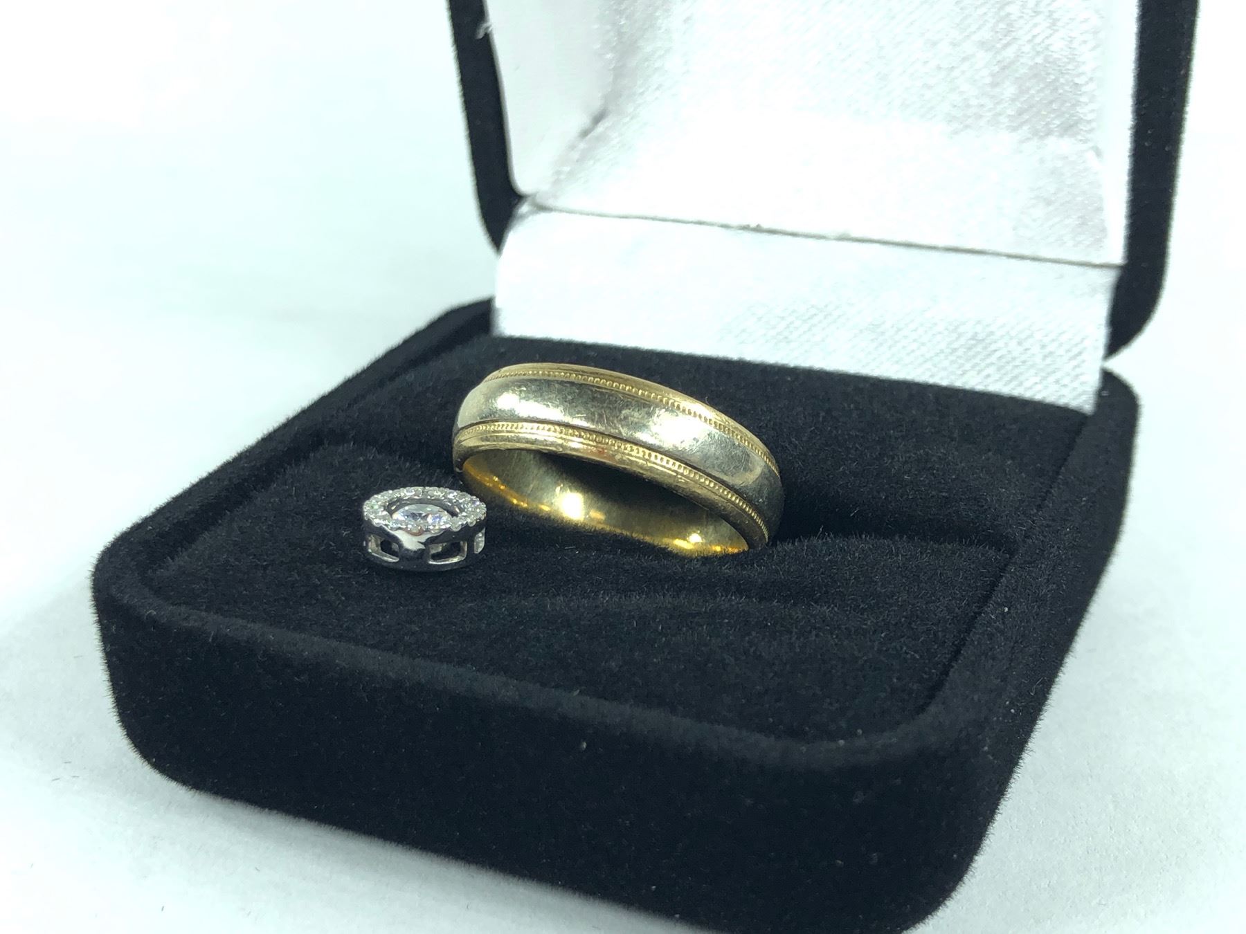 2 PCS TOTAL: 1-ONE 10KT WHITE GOLD DIAMOND PENDANT, ROUND HALO FRAME WITH 18 ROUND BRILLIANT CUT DIAMONDS APPROX 0.09 CARAT AND ONE ROUND BRILLIANT CUT DIAMOND IN CENTRE APPROX 0.25 CARAT REPLACEMENT VALUE $750, 2- ONE LADIES 14KT YELLOW AND WHITE GOLD BAND STYLE WEDDING RING, 5.85MM WIDE WITH 2 TONE DESIGN WEIGHS 6.20 GRAMS REPLACEMENT VALUE $775