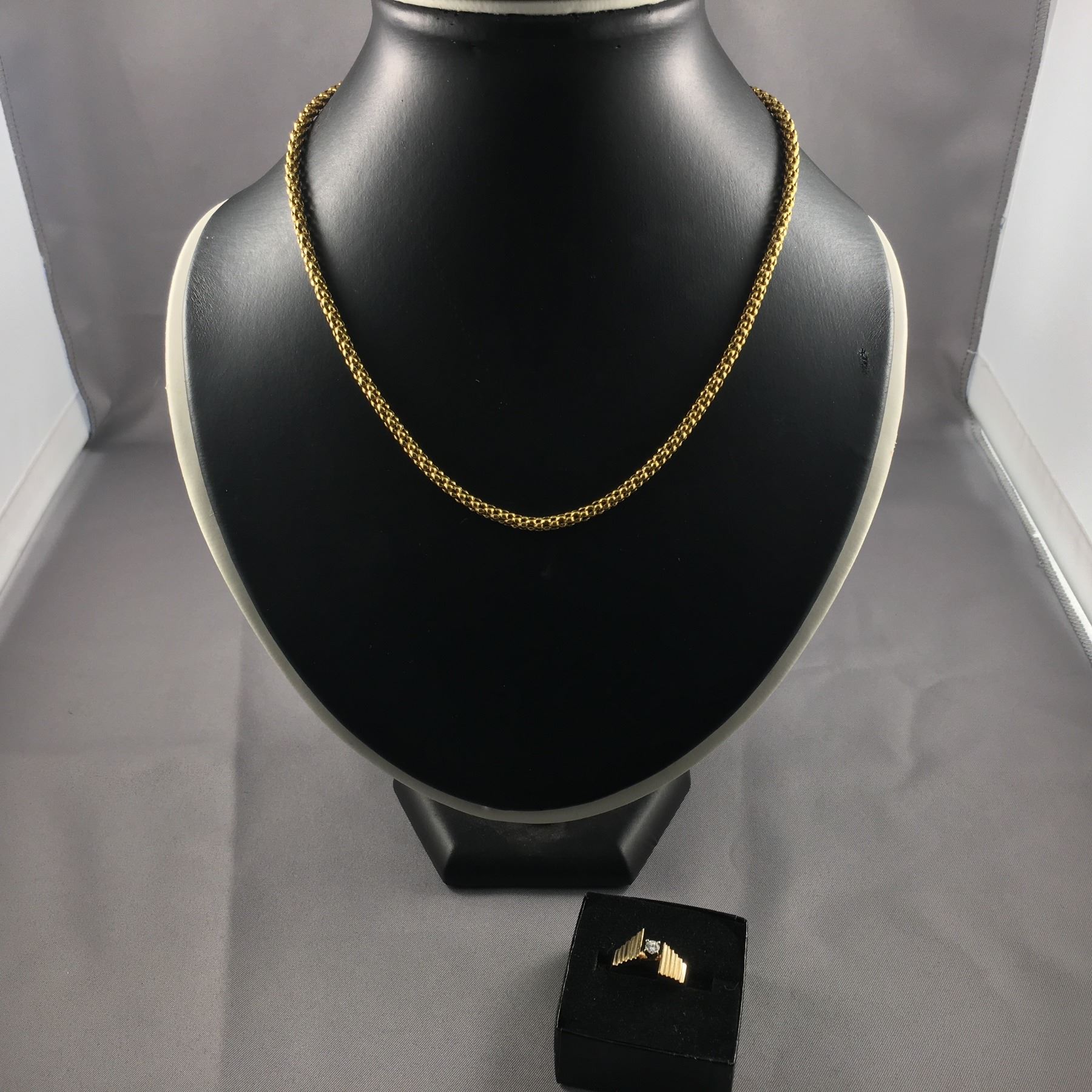 2 PIECES TTL. 1 - 10KT YELLOW GOLD & WHITE GOLD DIAMOND LADIES RING, CONTEMPORARY SOLITAIRE DESIGN & HAS YELLOW GOLD BODY WITH 8.90MM WIDE OFF SET & CORRUGATED SHOULDERS, 1 BRILLIANT CUT DIAMOND, APPROX WEIGHT 0.18CARAT, CLARITY SI 1, COLOUR H, CUT MEDIUM, REPL VALUE $700.00, 1 - 18KT YELLOW GOLD ROUNDED PROFILE FLEXIBLE LINK NECKLACE, WEIGHS 12.20 GRAMS, 45CM LONG, REPL VALUE $1,800.00