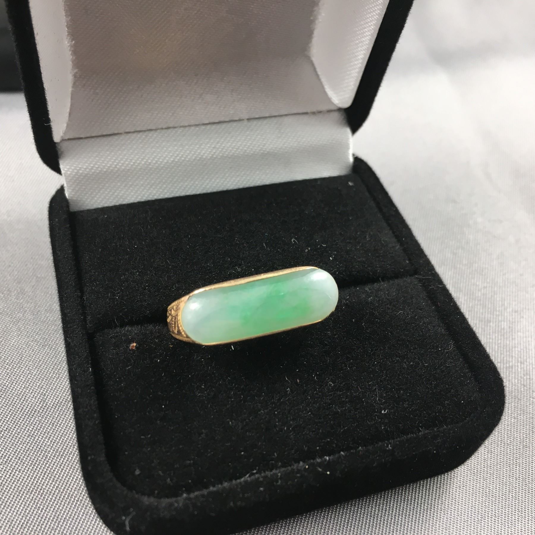 2 PIECES TTL. 1 - 22-24KT YELLOW GOLD CABLE LINK CHAIN, WEIGHS 19.20 GRAMS, 49CM LONG, REPL VALUE $2,400.00. 1 - 14KT YELLOW GOLD NATURAL BURMESE JADEITE SADDLE STYLE LADIES OR GENTS RING. 1 OVAL SHAPED SADDLE STYLE NATURAL BURMESE JADEITE, COLOUR LIGHT GREEN MOTTLING ON A CREAM BACKGROUND, TRANSPARENCY SEMI OPAQUE, WEIGHS 5.10 GRAMS, REPL VALUE $850.00