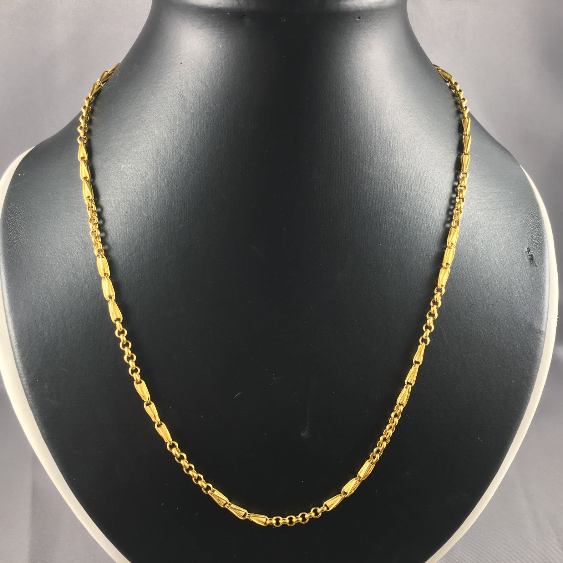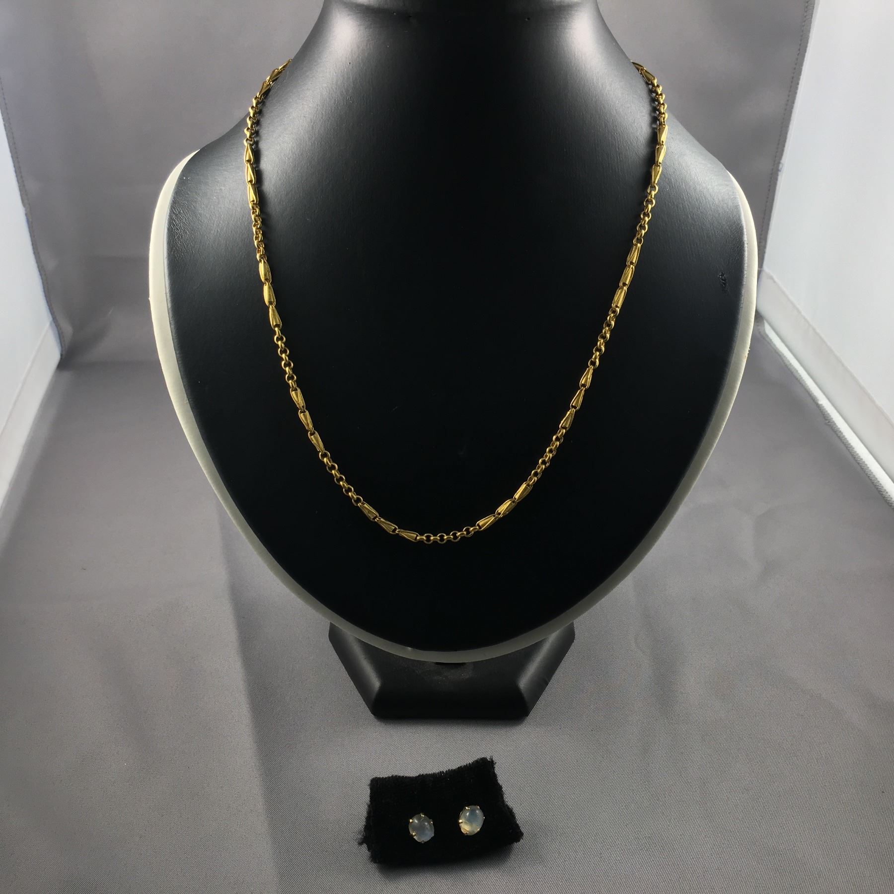 2 PIECES TTL. 1 - 22KT YELLOW GOLD SPIRAL BAR & PEA LINK CHAIN/NECKLACE. WEIGHS 19.40GRAMS, 50CM LONG, MARKED 999.9, REPL VALUE $2,400.00. 1 - PAIR OF 14KT YELLOW GOLD NATURAL WHITE MOONSTONE EARRINGS, SOLITAIRE DESIGN WITH 6 CLAW SETTINGS, 2 OVAL CABOCHON CUT NATURAL WHITE MOONSTONES, APPROX 8X6.92MM, SHEEN GOOD, CLARITY EYE VISIBLY INCLUDED & NATURAL SURFACE BLEMISHES, PAIR WEIGHT 2.70 GRAMS, REPL VALUE $325.00