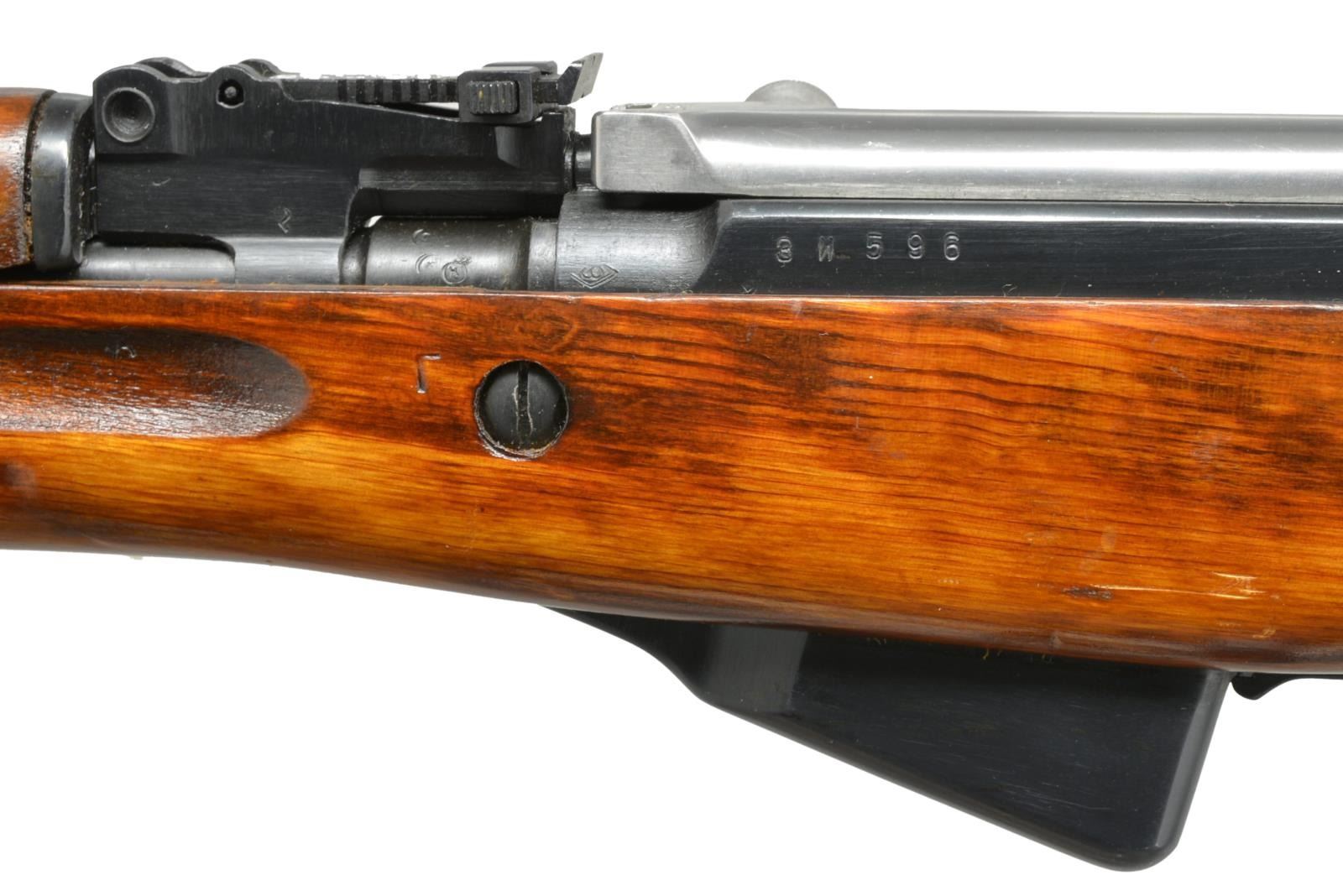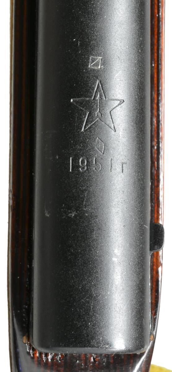 1) Cal. 7.62x39. S# CCCP30979 Import marked on right side of receiver. Given new S#. Original S# MN956 matches on receiver stock bolt & trigger guard. Bbl. 20 5/8". Top cover marked w/ arrow & star indicating mfg. at Tula Arsenal, dated 1951. Tangent rear sight graduated to 1000m. Post front sight w/ protective hood. Cleaning rod is present. 9 & 1/2" Fullered blade folding bayonet. Laminated stock set. Stock has additional recoil bolt below rear of receiver. Cleaning kit in butt. Brown web sling. CONDITION: very good arsenal rework finish on wood & metal w/ very light handling marks. Good bore w/ lightly worn lands. (21-515/RW). 2) Cal. 7.62x39. S# CCCP48052. Import marked on right side of receiver. Original S# 3 in 596 matches on receiver, bolt, trigger group & buttstock. Bbl. 20 1/2". Receiver marked on top w/ arrow in star indicating mfg. at Tula Arsenal, dated 1952. Tangent rear sight graduated to 1000m. Post front sight w/ protective hood. Cleaning rod is present. 9 3/8" Fullered blade folding bayonet. Hardwood stock set. Cleaning kit in butt. Buttstock has series of sm. x's stamped in left side. CONDITION: wood & metal have arsenal rework finish w/ very good appearance, stock has very light wear & scattered handling marks. Near excellent shiny bore. (21-516/RW). BOTH CURIO. $800-1,200.