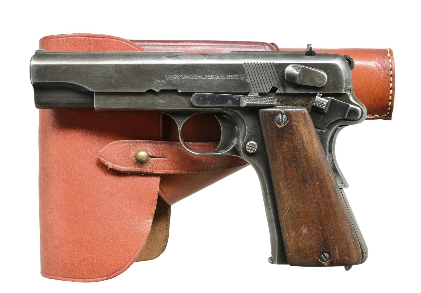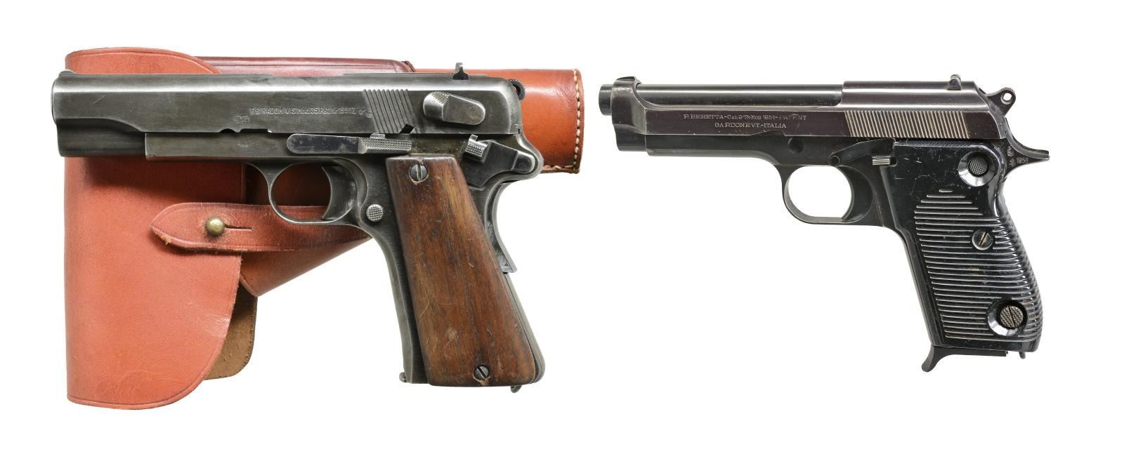 1951. BOTH: cal. 9mm Luger. 1) RADOM MODEL 35. S# H9245. Bbl. 4 3/4". Mfg.1935-1945 w/ matching numbered bbl. & slide. Type 2 w/ 3 levers & no stock slot having German WaA77 proofs. Replacement smooth hardwood grips. MAGS: 1 good 8 rd. w/ eagle "625" proof at bottom of right side. UNATTACHED ACCESSORIES: post war style tan double flap holster w/ stud strap retention, single wide belt loop & spare mag. pouch; very good w/ no markings. CONDITION: good general appearance w/ considerable hand & holster wear. Appearance of cleaned light oxidation. Well made grips w/ wear, light marks & sm. chip. Fair bore; worn w/ even light to moderate pitting. (20-2521/NW). 2) BERETTA MODEL 1951. S# C3074. Bbl. 4 1/2". Mfg. 1956 as Italian service pistol replaced by popular Model 92. Commonly referred to as 951 Brigadier yet slide marked "Mod 1951". Grooved brown plastic grips w/ recesses for hammer block safety & bottom rear mag. release. Ring hammer & lanyard loop. Matching numbered bbl. & "MADE IN ITALY" marked slide. Right front of frame w/ import mark. MAGS: 1 very good 8 rd. w/ finger extension. CONDITION: very good general appearance w/ light high point wear & occasional peppery oxidation. Solid grips w/ light marks throughout. Good to very good bore w/ very slight wear & hint of frosting. (20-2530/NW). BOTH CURIO. $800-1,200.