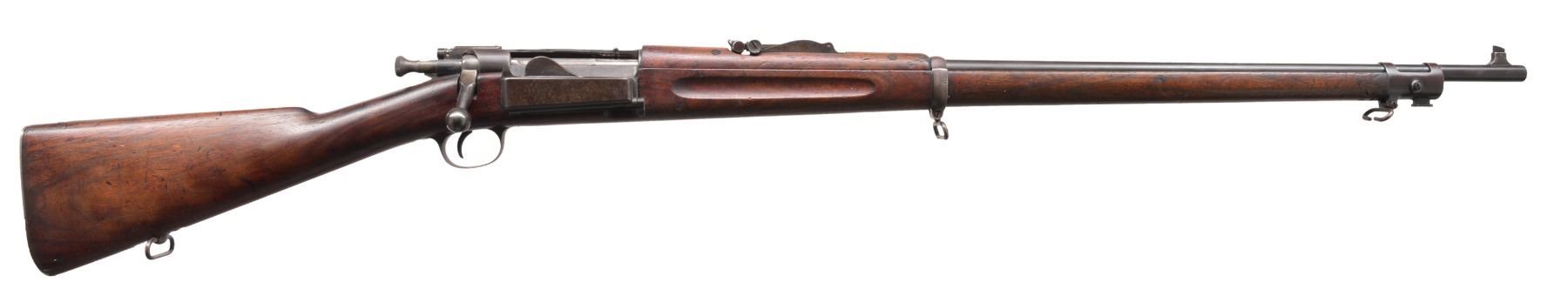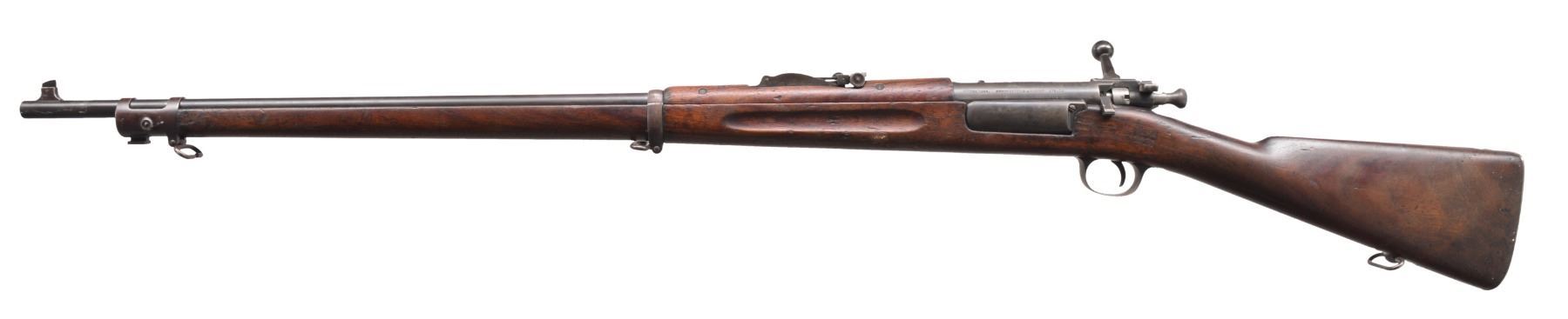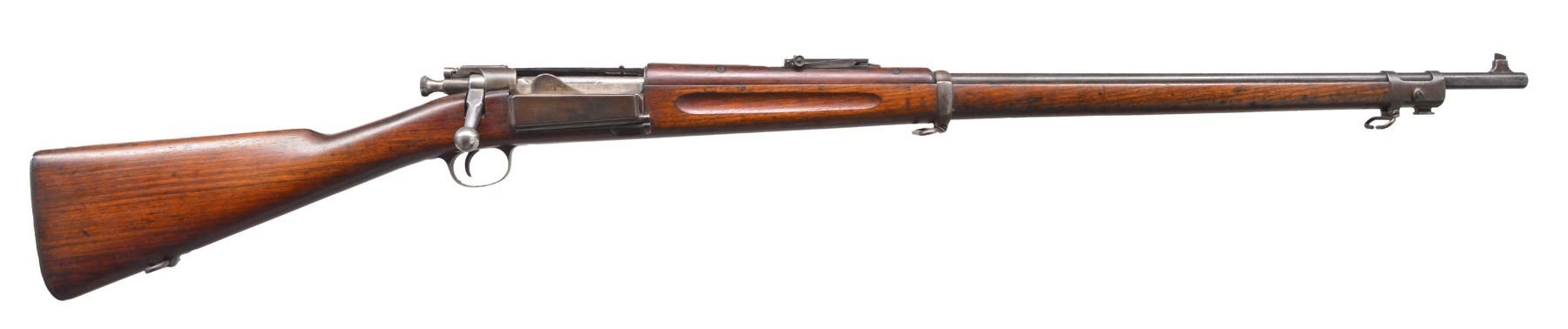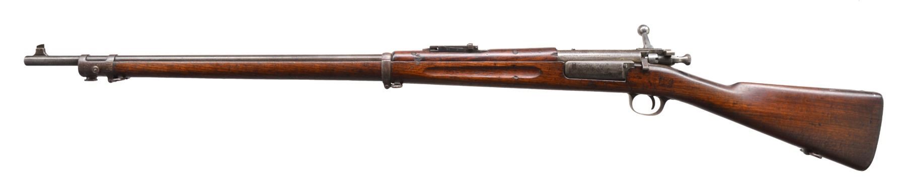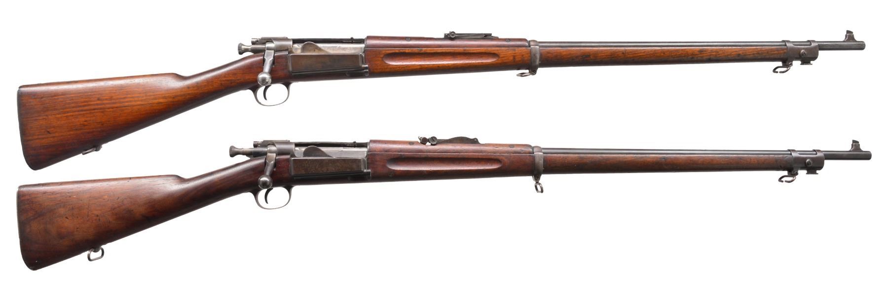 BOTH: cal. 30-40 Krag. Bbls. 30". Type 4 pinned blade front sights. Band fastened full length finger groove walnut stocks & handguards. 1) S# 110752. Model 1901 rear sight. Left side of stock has lightly visible cartouche w/ 1902 date. CONDITION: metal finish has faded to mottled gray brown. Sanded & refinished stock shows numerous scratches, handling marks & gouges. Dark bore shows worn rifling & generally light pitting. (19-5926/DS). 2) S# 475408. Model 1898 rear sight. Left side of stock has clear cartouche w/ 1903 date. CONDITION: metal finish is fading to gray showing handling marks. Stock has worn finish showing scratches, dents & gouges. Dark bore has worn rifling & general light pitting. (19-5927/DS). BOTH CURIO. $900-1,300.