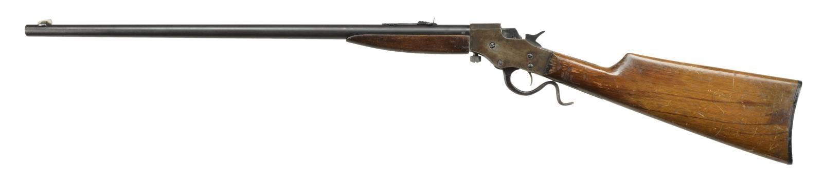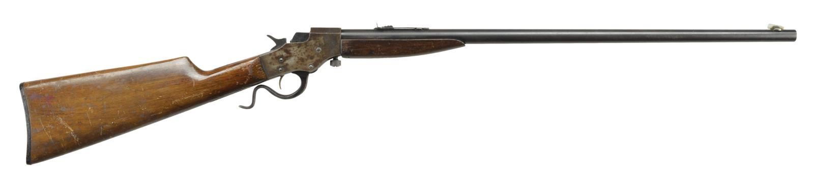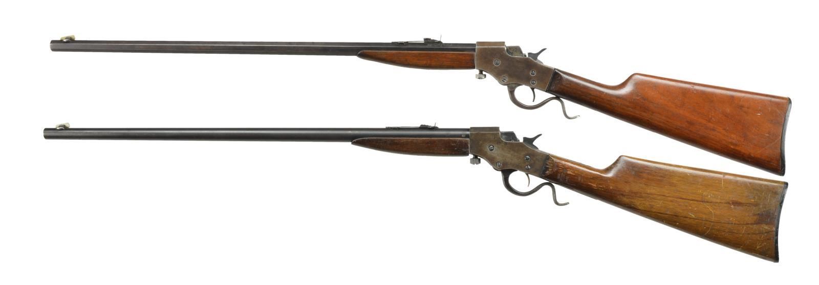 2) S# K740. Rnd. bbl. w/ adj. rear sight. "STEVENS" in S shaped banner hard rubber buttplate. CONDITION: Good blue w/ peppery oxidation & marks. Fair receiver w/ oxidation. Fair worn peeling finish w/ deep marks, & red paint. Good bore. (22-2070/MD). ALL CURIO. $300-500.