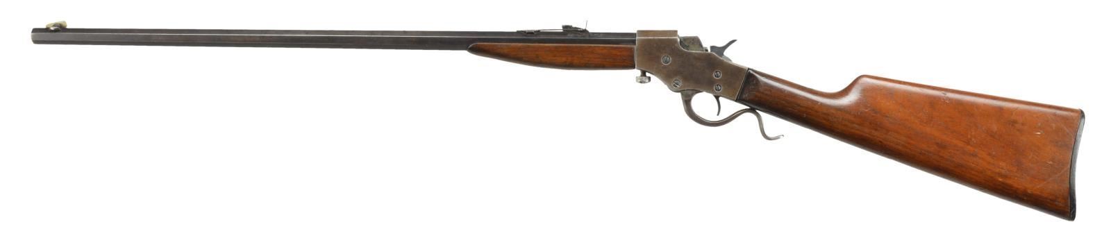 1) S# O719. Oct. bbl. w/ adj. rear sight having replacement elevator. Stevens Favorite hard rubber buttplate. CONDITION: Good bbl. blue fading to brown w/ wear, oxidation & marks. Fair brown patina receiver. Good sanded & refinished stock w/ marks, sm. cracks & few chips. Fair bore. (22-2069/MD)