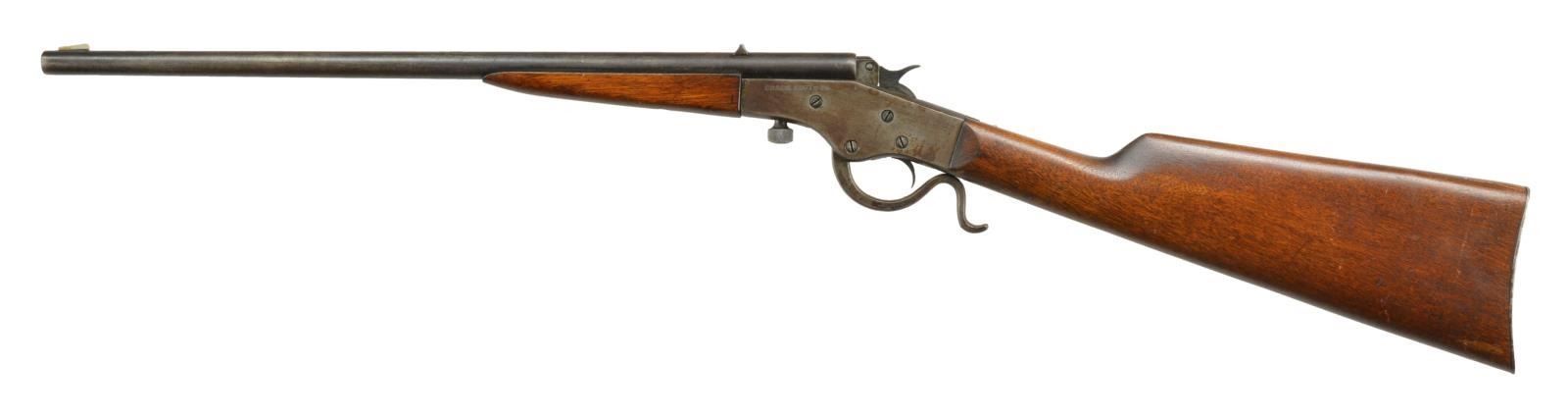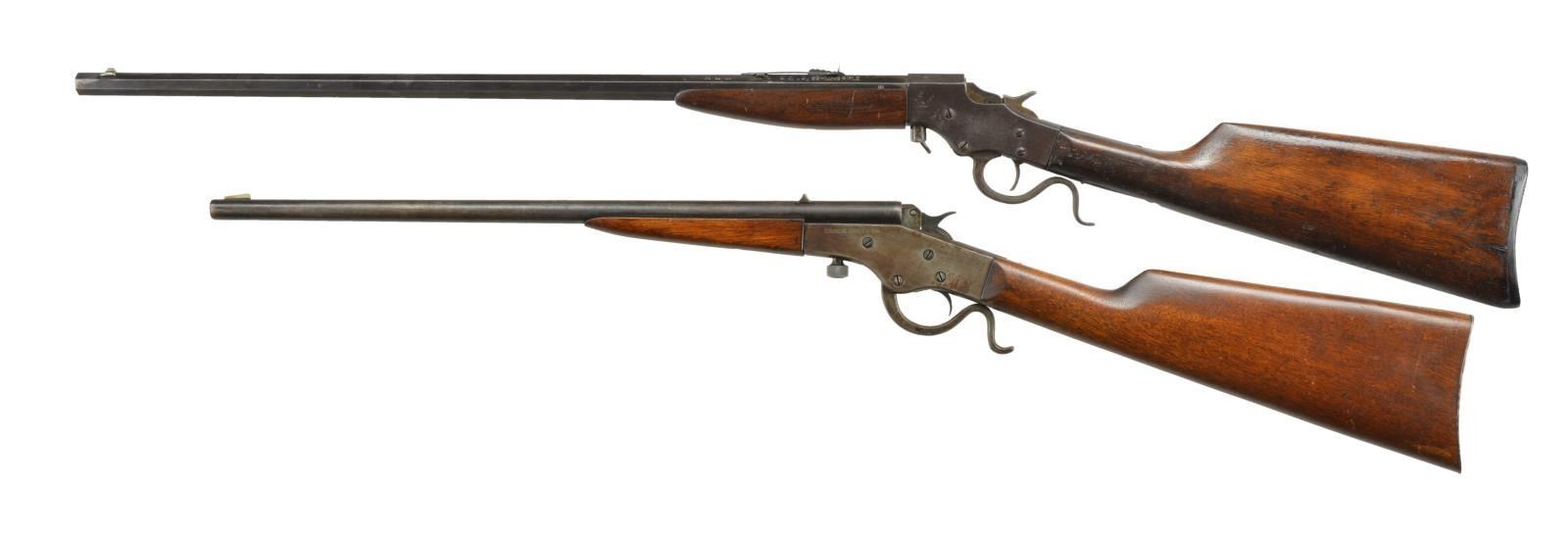 2) NO. 26 CRACKSHOT. Cal. 22 LR. NSN. Bbl. 18" w/ fixed sights. Walnut stock set. CONDITION: fair blue turning brown w/ marks & oxidation. Fair brown receiver w/ pitting & oxidation. Good stock w/ marks. Poor pitted bore. (22-2072/MD). ALL CURIO. $300-500.