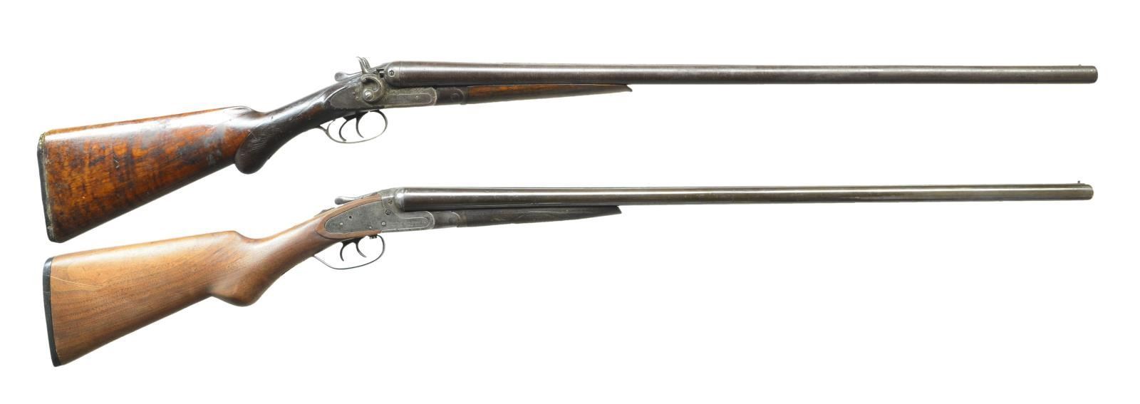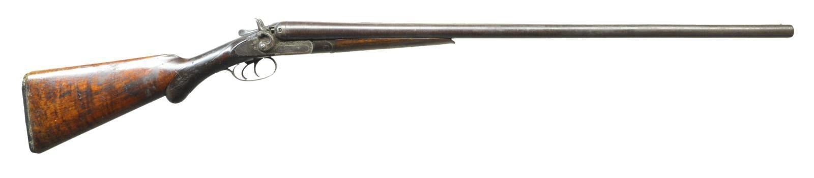 2) BELGIAN US ARMS HAMMER. Cal. 10 Ga. S# 13540. Bbls. 32" of Laminated steel w/ bead. Side lock action w/ dbl. triggers & extractors. Walnut forearm & rnd. knob pistol grip stock w/ homemade leather pad. CONDITION: fair gray patina metal w/ pitting & oxidation. Fair worn wood finish w/ marks, chips & cracks. Fair buttpad. Pitted bores. PROVENANCE: Estate Collection of Jack Verret Sr. (22-826/MD). ALL MODERN. $75-100.