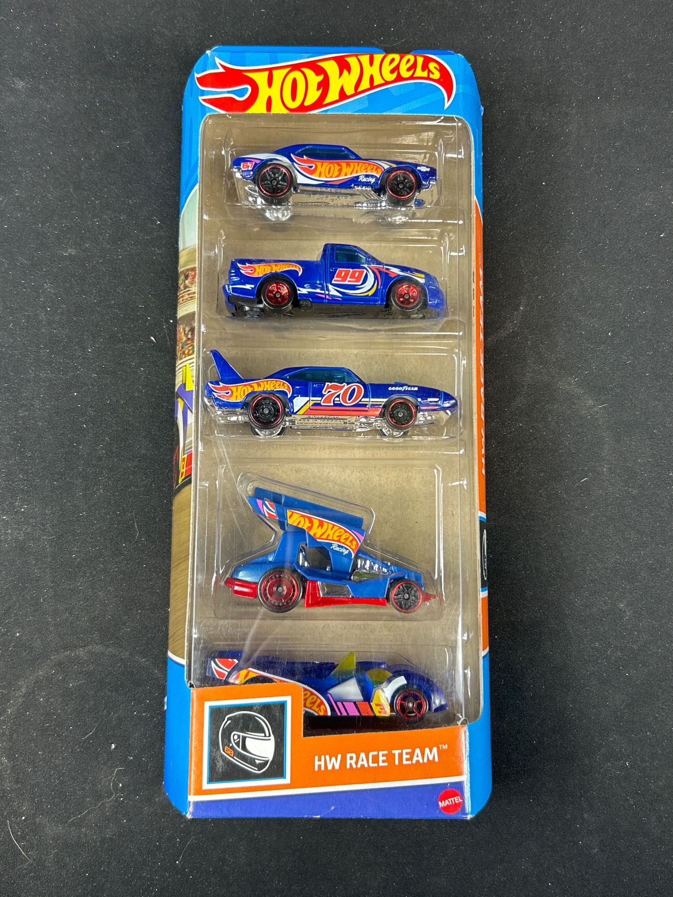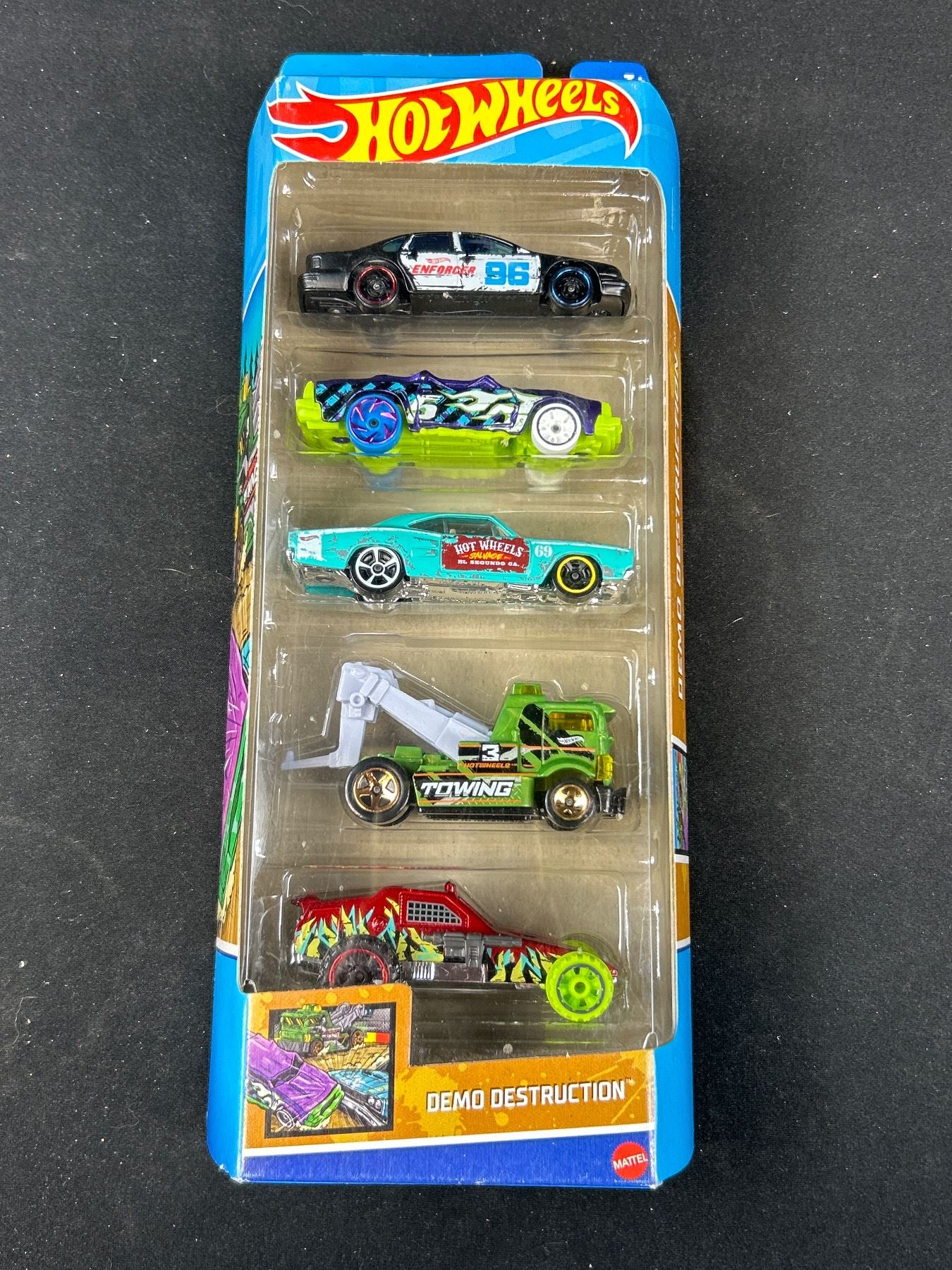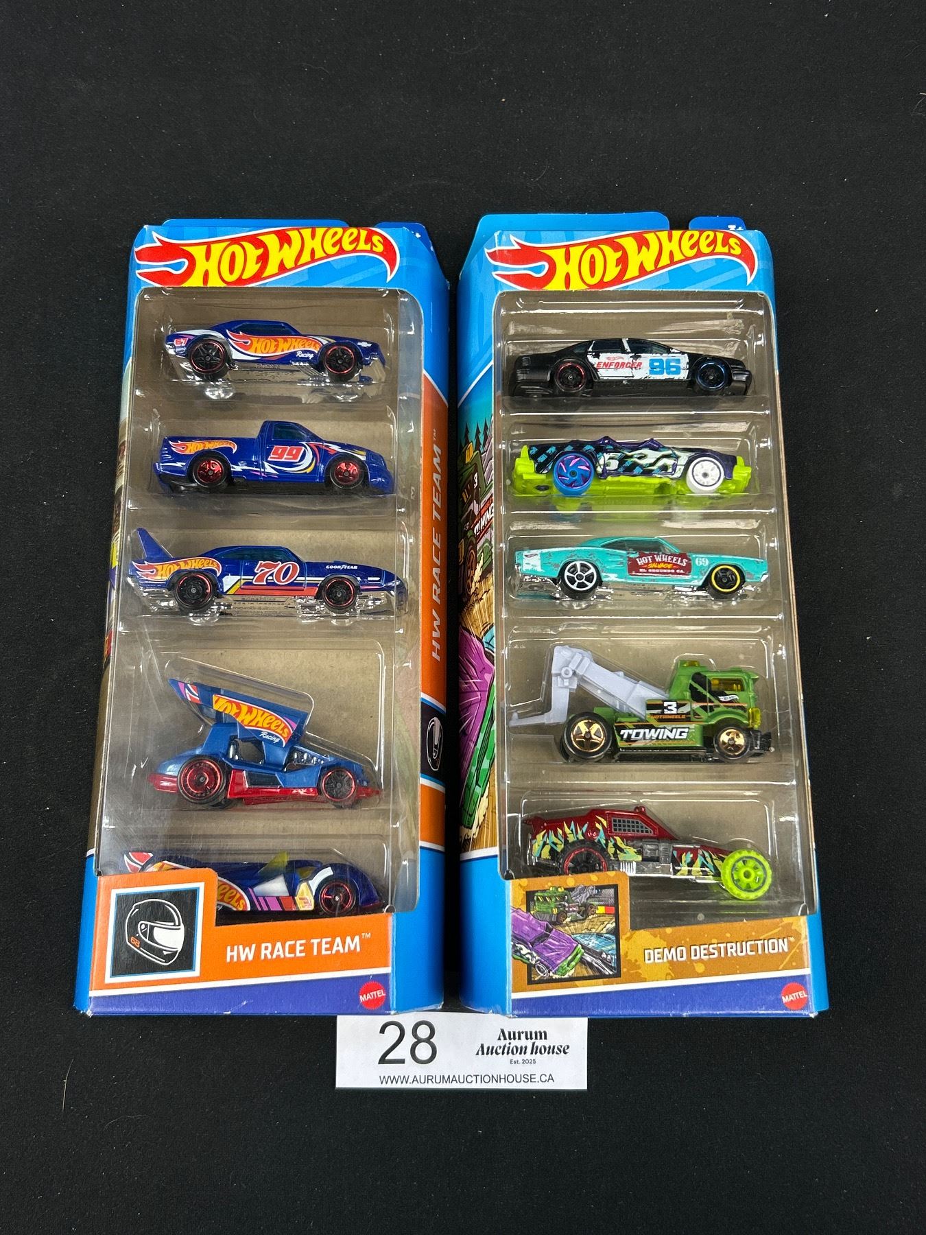 2 Sets of 5 Hotwheels Sets, Demo Destruction and HW Race Team