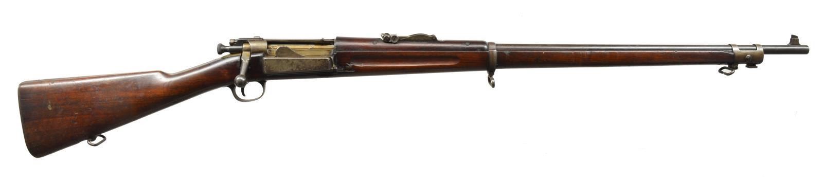 1) Cal. 30-40. S# 303085. Bbl. 30". Model 1902 tangent rear sight w/ sliding peep, graduated to 2000yds. Blade front sight. Walnut stock set. Buttstock has trap & curved toe. Buttstock is unmarked except for encircled script “P” proof. CONDITION: stock set has moderate wear, dents, scratches & staining throughout w/ original finish. Metal turning overall gray & patina w/ traces of blue in protected areas. Scattered spots of oxidation & fine pitting, notable on loading gate & right side of receiver bridge. Good bore w/ lightly worn lands. (20-2235/RW). 2) Cal. 30-40. S# 134037. Bbl. 30". Model 1896 rear sight graduated to 1800yds. Blade front sight. Trap buttplate. Walnut stock set. Curved toe buttstock. Marked on left side over trigger guard w/ faint boxed “JSA 1898”. Marked under grip w/ faint circle “P” proof. CONDITION: stock set has well worn original finish w/ moderate staining, dents & scratches throughout. Notable open knot in cheek area w/ added filler. Metal has traces of original blue turning mostly gray w/ wear & scattered sm. spots of oxidation. Bore is good w/ sharp rifling & several scattered sm. hits. (20-2236/RW). BOTH CURIO. $1,000-1,300.