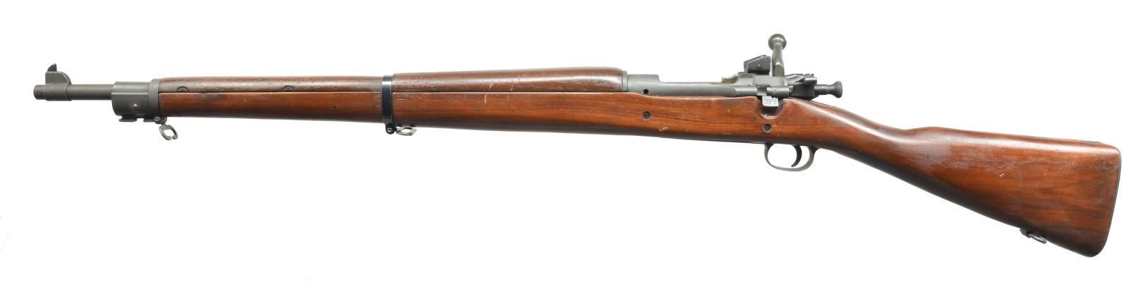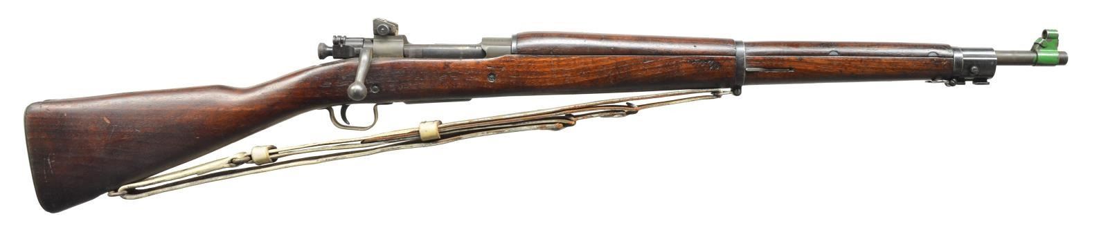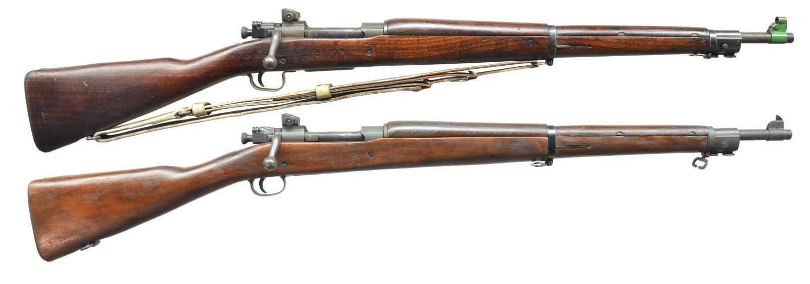 RIFLES. 1) Cal. 30-06. S# 3959684. Bbl. 24" marked behind front sight “RA”, flaming bomb & “7-43”. All visible parts marked “R”. Adj. aperture rear sight. Blade front sight w/ snap on sheet metal cover which is painted green. All stamped furniture including lg. bow trigger guard & fine, checkered buttplate. Walnut stock set w/ 2 recoil bolts. Marked w/ very faint “FJA” over trigger guard on left side & circle “P” proof under grip w/ 4 inspectors marks forward of trigger guard. UNATTACHED ACCESSORIES: white painted, military style leather sling w/ extensive cracking & wear. CONDITION: stock set has moderate wear, dents, staining & scratches throughout. Notable sm. gouges in cheek area. Handguard has 5" crack on top forward of receiver. Metal has 70% original finish w/ wear, scratches & sm. spots of oxidation. Painted muzzle cover has wear & flaking. Good, shiny 4-groove bore. (20-2974/RW). 2) Cal. 30-06. S# 3599799. Bbl. 24" marked behind front sight “RA”, flaming bomb & “8-34”. Adj. aperture rear sight. Blade front sight. All stamped furniture, except for milled trigger guard. Bolt marked underneath w/ “R”. Scalloped bolt sleeve marked “BP”. Cutoff marked “R”. Walnut stock set marked w/ boxed “SA” & “J” overhaul mark on left side of butt. Encircled “P” proof under grip. Marked “P” in cutout recess. CONDITION: arsenal refinish stock set has very nice appearance w/ light wear & scattered handling marks w/ crisp markings. Metal retains very lg. degree of arsenal rework parkerization w/ very light high point wear. Very good, shiny 2-groove bore. (20-2996/RW). BOTH CURIO. $700-1,000.
