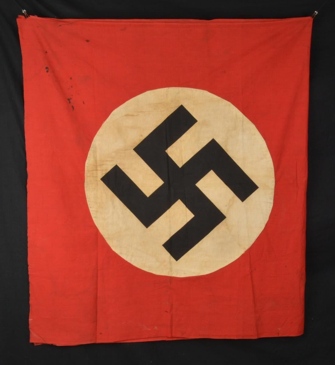 1) A red bodied Party flag w/ printed black Party symbol on a sewn white circular field. Flag measures approx. 88" x 47". CONDITION: flag is substantially intact w/ minor stains & a few sm. tears. 2) A red bodied Party flag w/ printed black Party symbol on a sewn white circular field. Flag measures approx. 90" x 50". CONDITION: flag is substantially intact w/ minor stains & a few sm. tears. (02-15193/BF). $300-500.