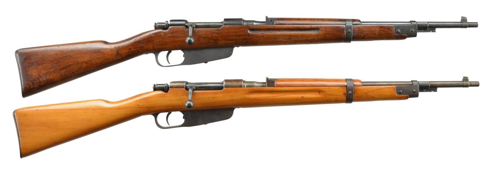 SHORT RIFLES PRODUCED BY TERNI & MARKED FOR FINLAND. ALL: cal. 7.35 Carc. (7.35x51mm). Approx. 94,500 Model 38 short rifles were shipped to Finland & saw use in the Winter War against the USSR. Bbls. 21". Blade front sights & fixed rear sights marked "CAL. 7.35". Bbl. shanks marked "SA" indicating Finnish acceptance. Blue finish. 2 Piece hardwood stocks.