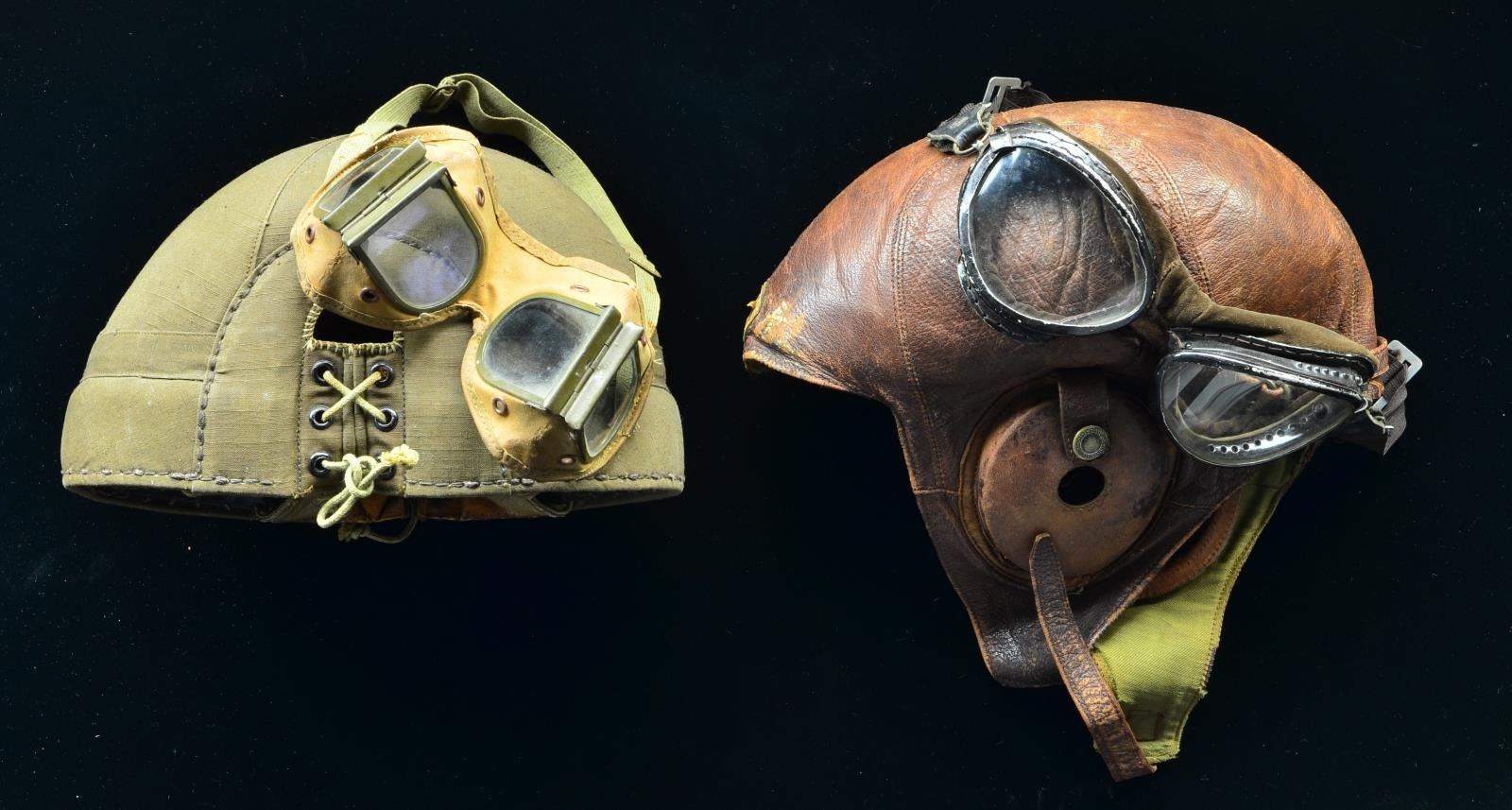1) SUMMER FLIGHT. Brown leather helmet measuring approx. 6" diameter w/ 2 characters & red star in white circle on front. Helmet has 2 ear cups w/ studs & straps along w/ chin strap . Green colored silk style interior lining . Right ear cup has 3 stamps. comes with glass goggles held in metal retainer w/ elastic cords. CONDITION: Fair exterior leather w/ flexing, scuffs, loose stitching & faded markings. Liner is deteriorating at leaf chin strap, good overall. Goggles good w/ some loss of paint. on metal.