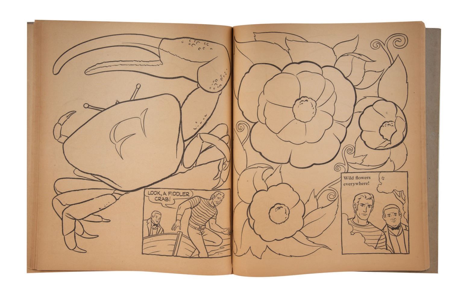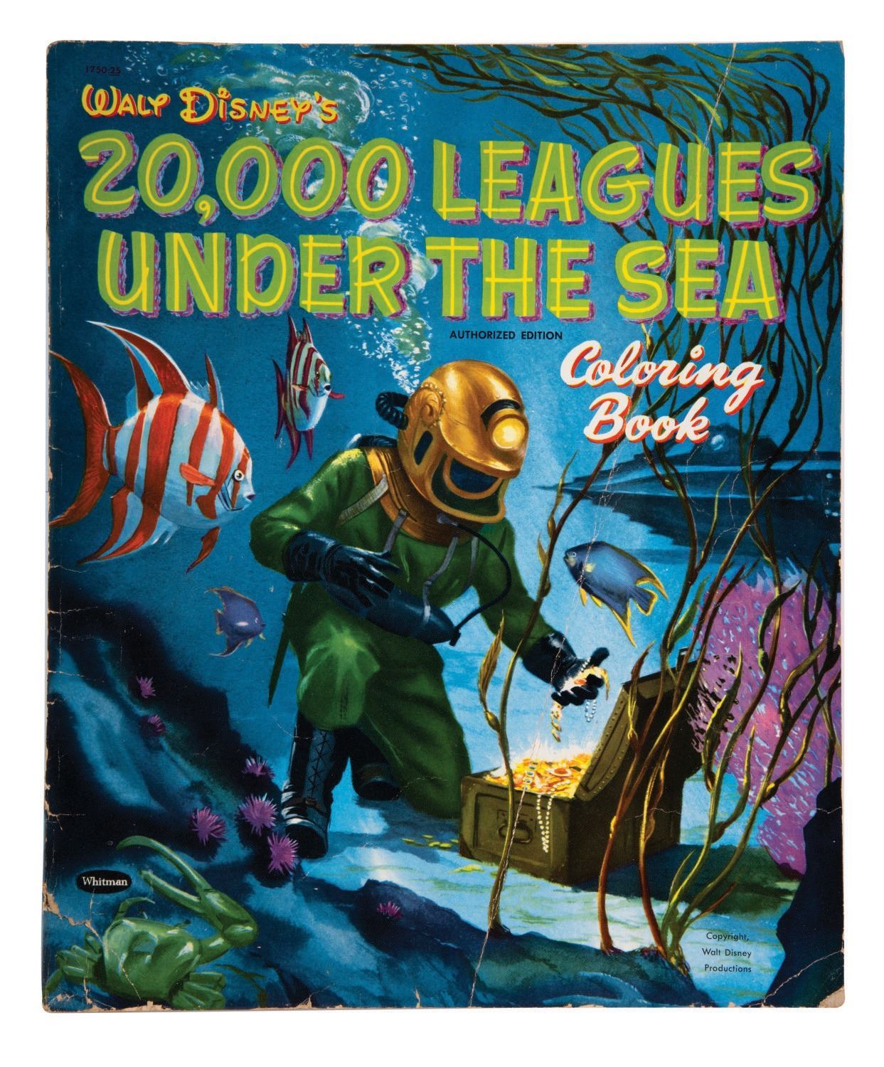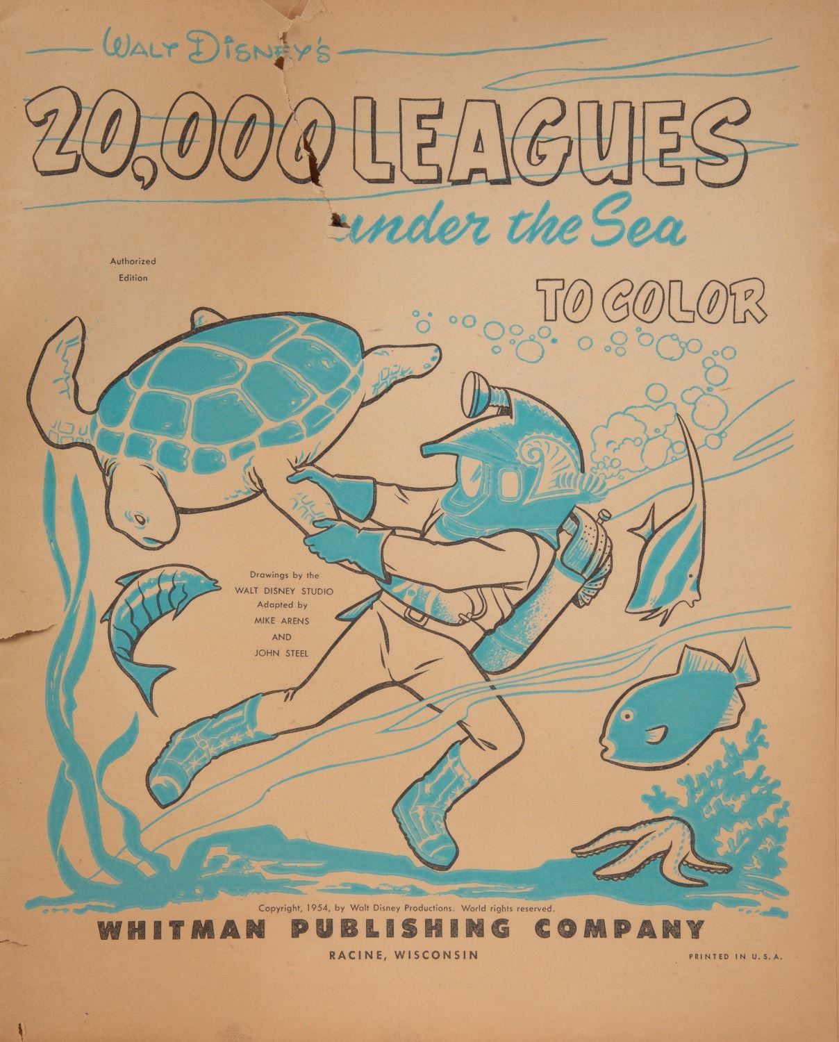 (Whitman, 1954) A (60) page Walt Disney's 20,000 Leagues Under the Sea Coloring Book by Whitman. Measuring 13.5"x11", the book is in fair to good condition with only (17) colored pages, and a tear along the top-edge of (8) of the first interior pages.