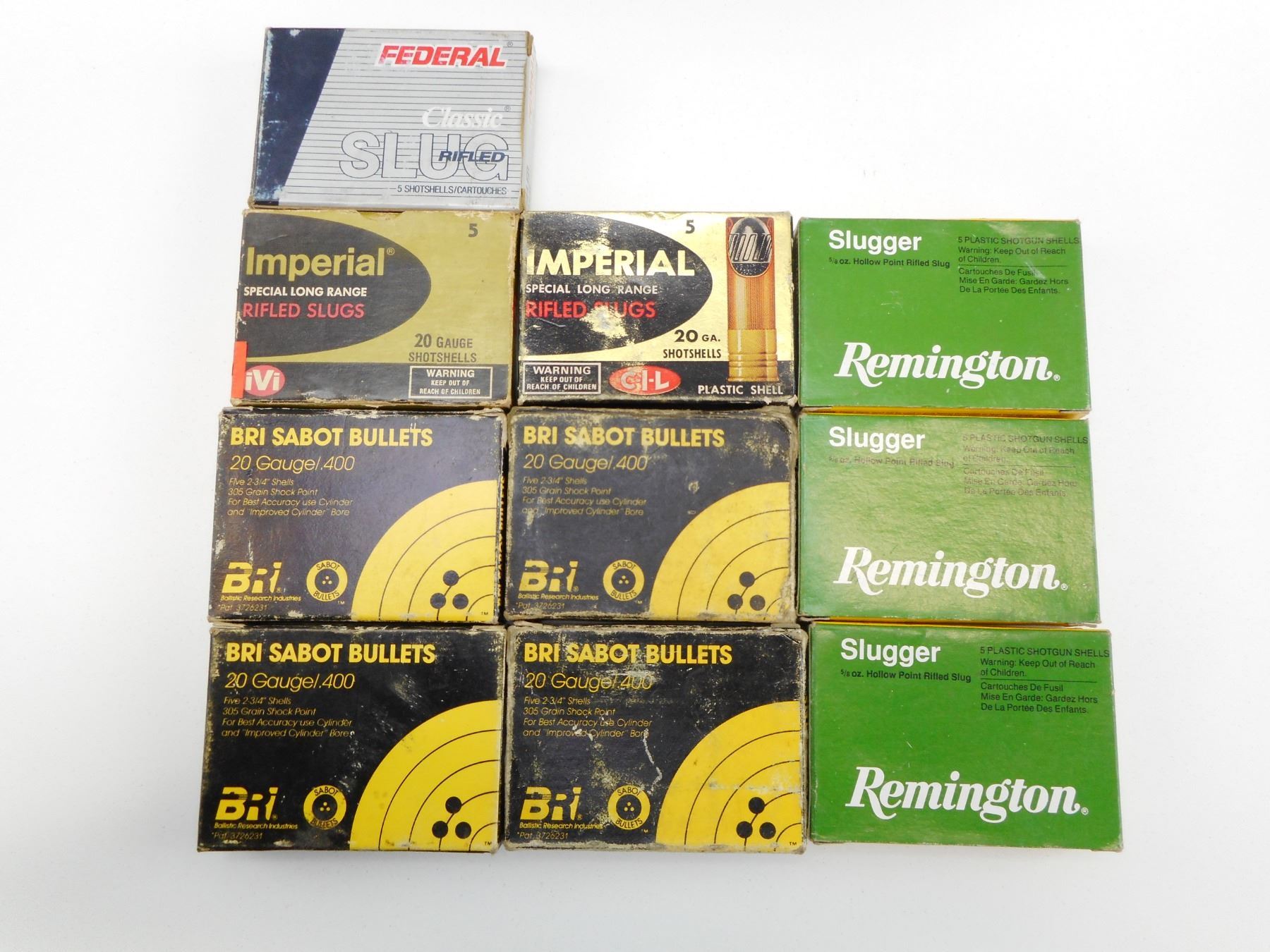 20 GAUGE ASSORTED SHOTGUN SHELLS , 45 20 GA, 2 3/4" ASSORTED SHOTGUN SHELLS, INCLUDING REMINGTON SLUGGER, IMPERIAL RIFLED SLUGS, FEDERAL SLUG, BRI SABOT BULLETS