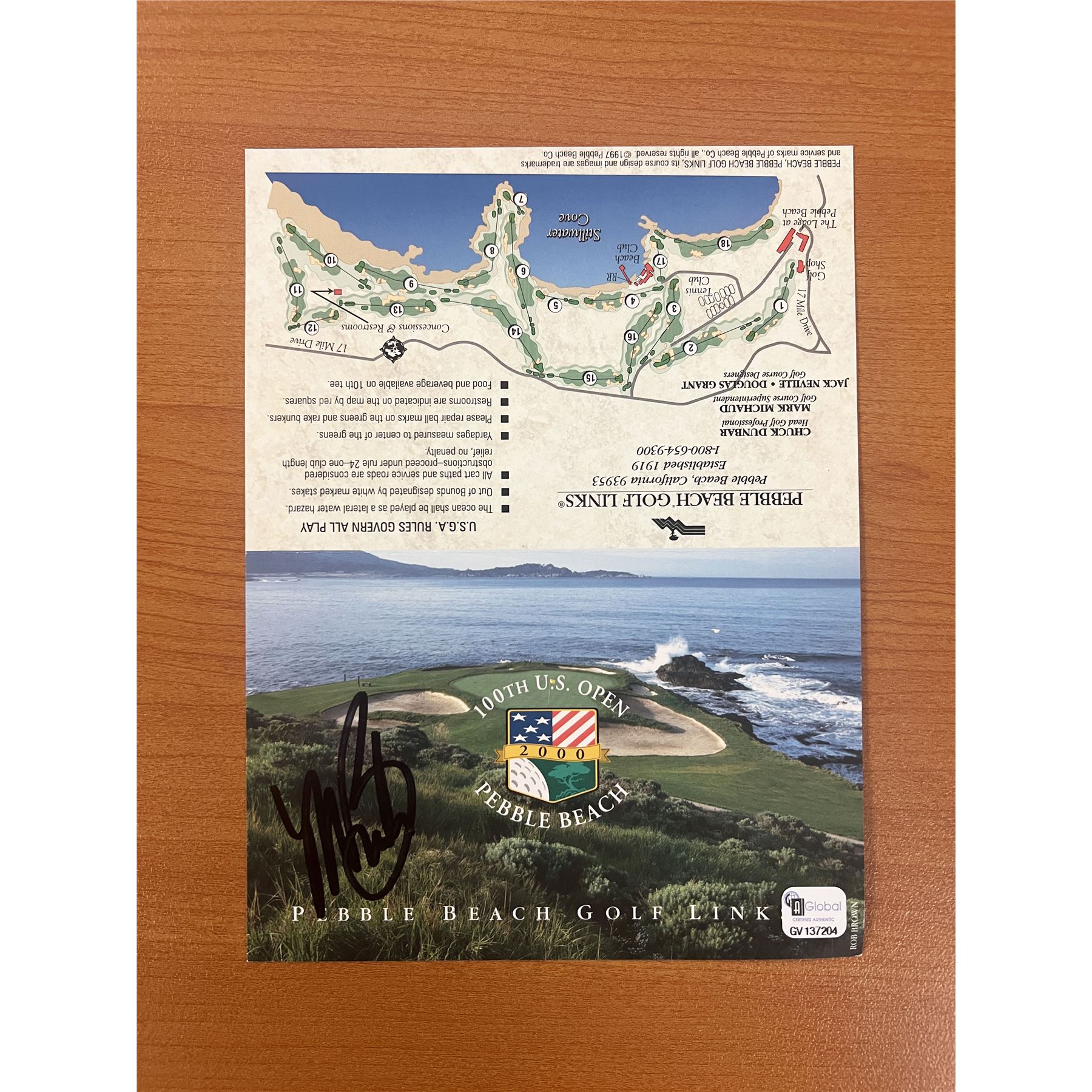 2000 Pebble Beach 100th U.S. Open Championship Mark Brooks signed card-Global Authenticated. 6x8 inches