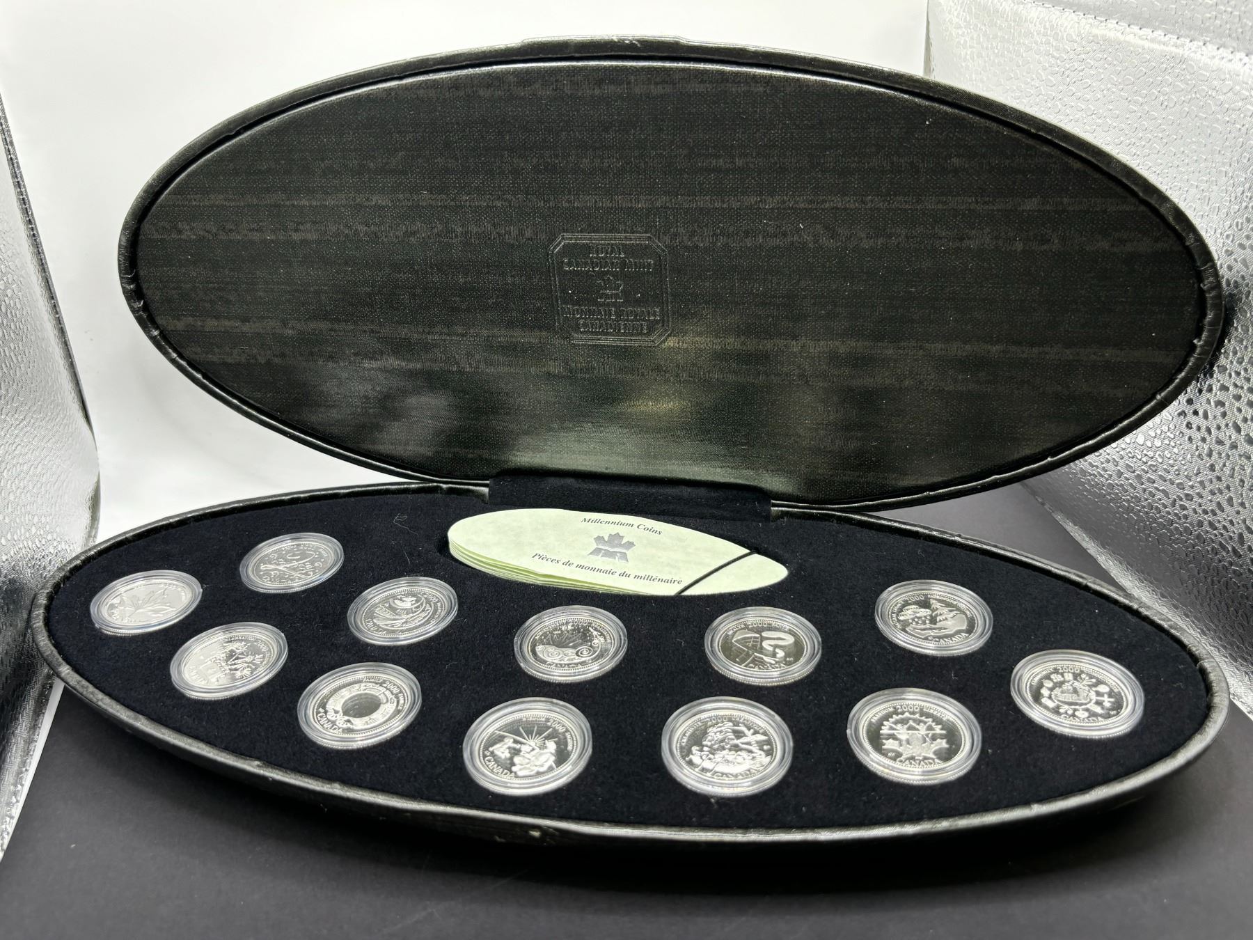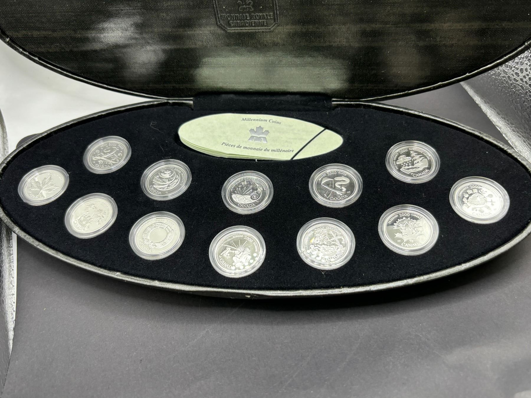 Issued as part of the Millennium celebration set of coins, all 12 25-cent coins come in black oval case. May or may not include outer cardboard box.