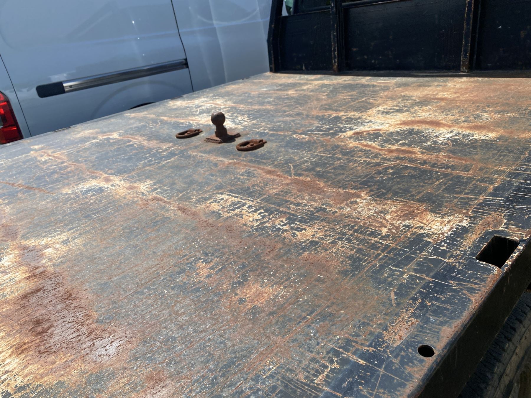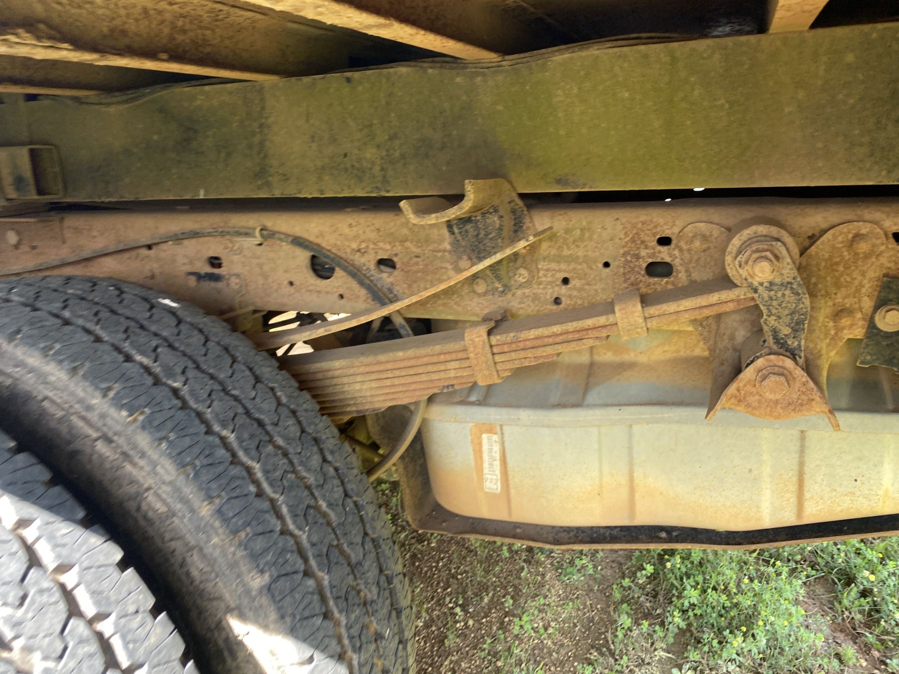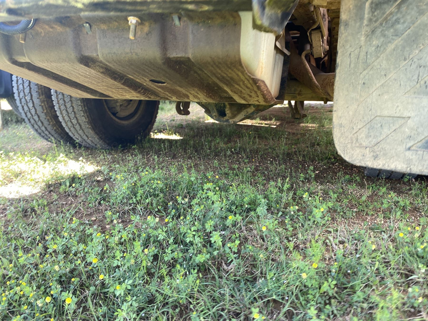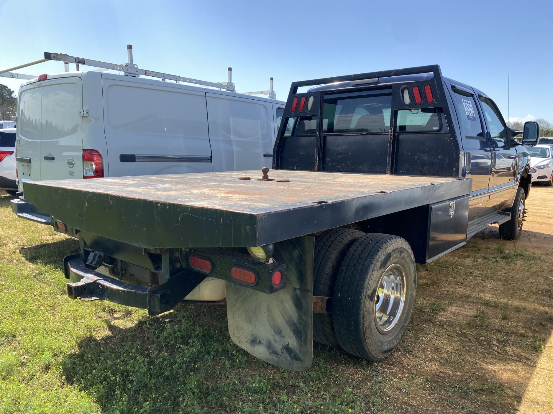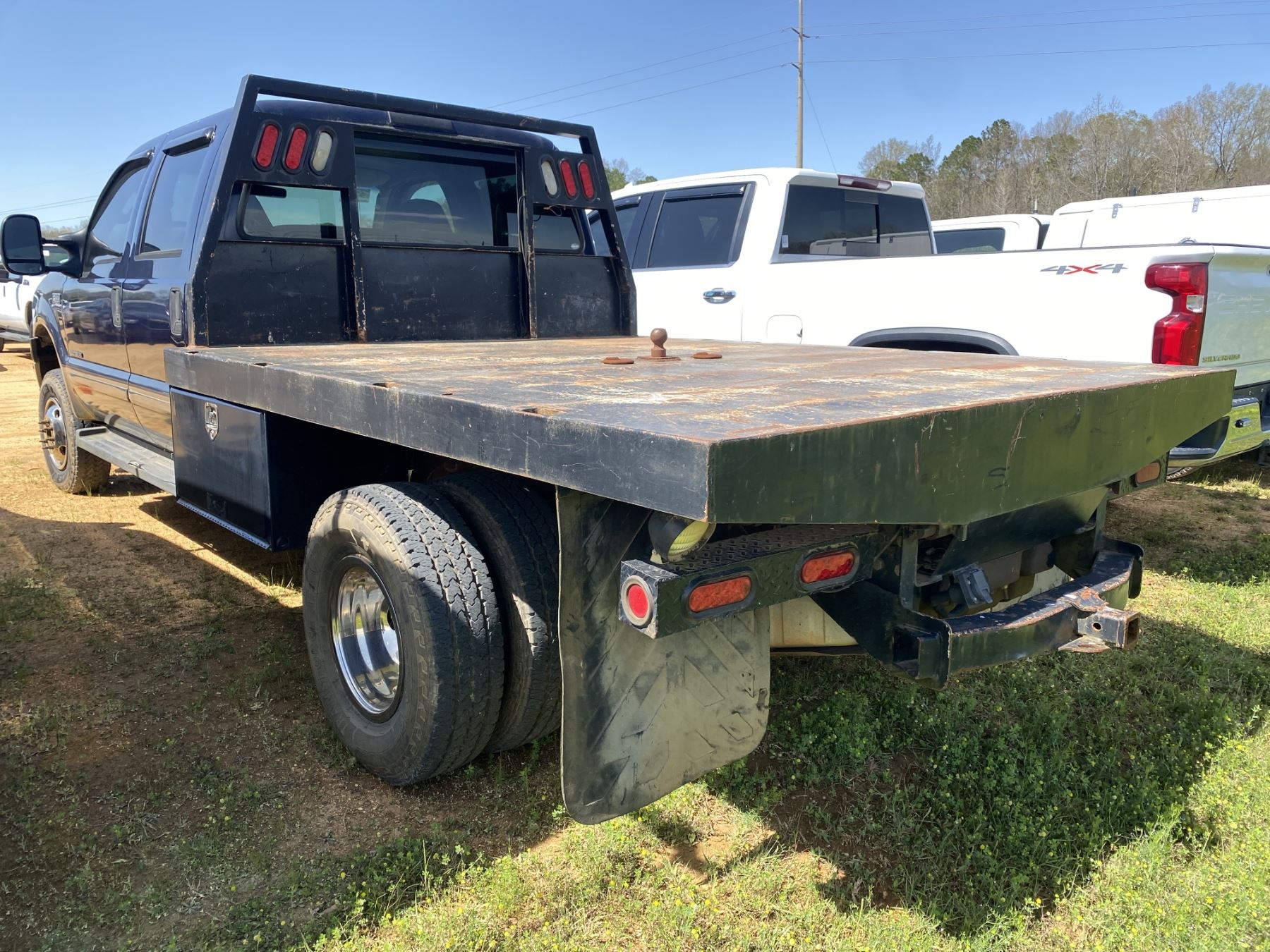 Dually, 4x4, crew cab, PowerStroke diesel engine, A/T, headache rack, 9' flat dump bed (needs hydraulic pump)