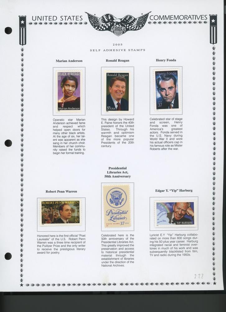 6 x 37c Stamps: Marian Anderson; Ronald Reagan; Henry Fonda; Robert Penn Warren; Presidential Libraries Act 50th Anniversary; Edgar Y. "Yip" Harburg