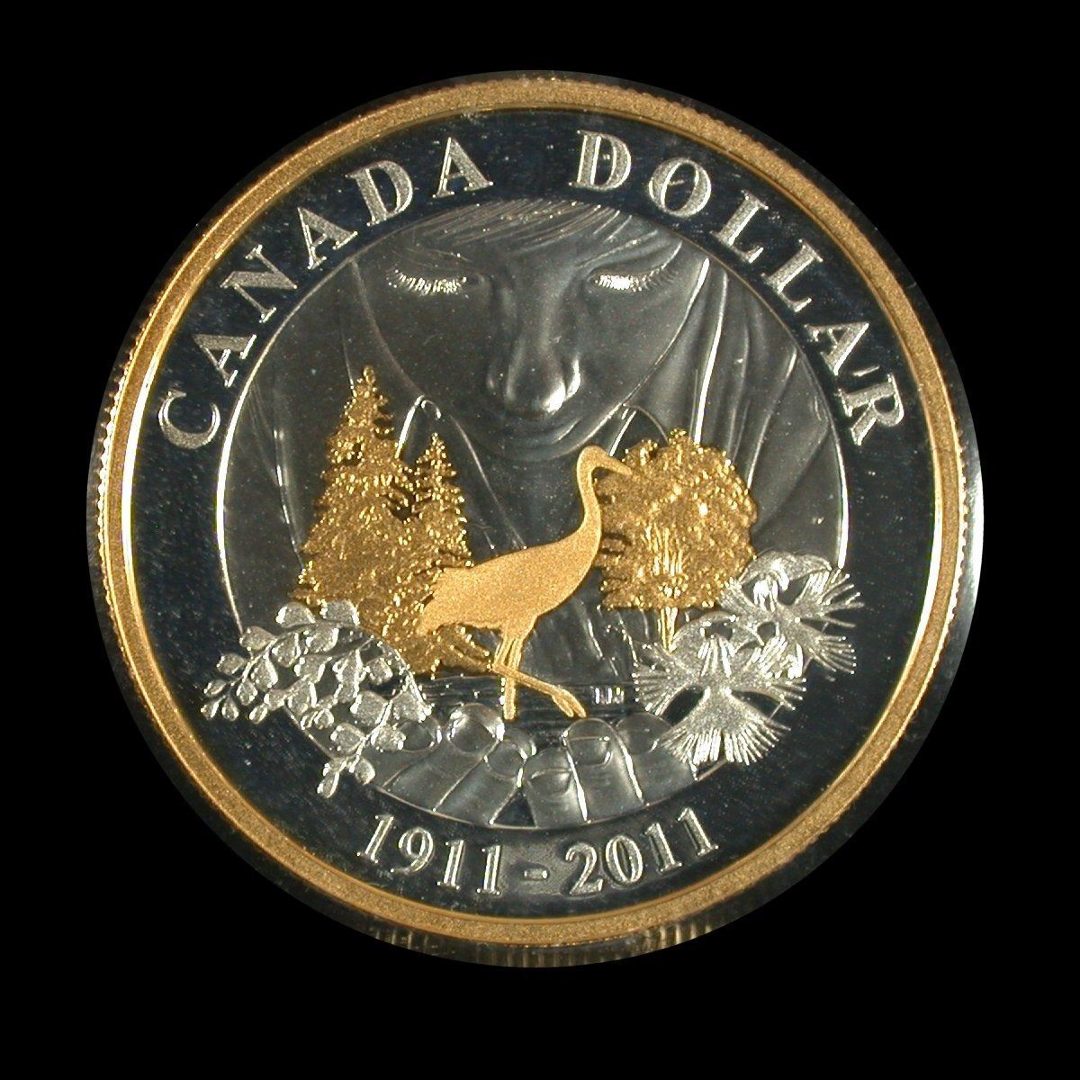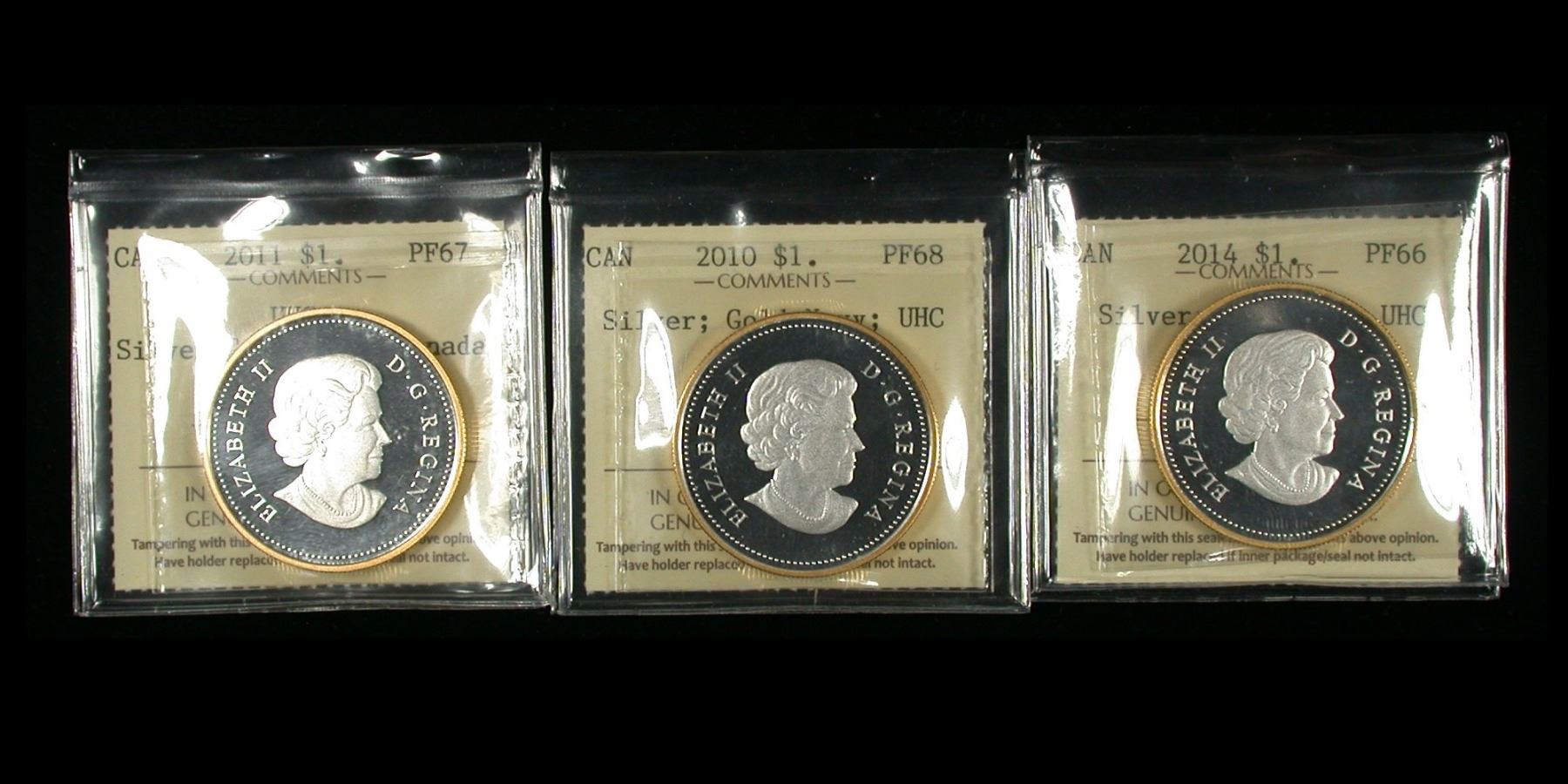 2010 Silver & Gold Navy Dollar, ICCS PF-68 UHC; 2011 Silver & Gold Parks Canada Dollar, ICCS PF-67 UHC; together with a 2014 Silver & Gold WWI Dollar, ICCS PF-66 UHC. Lot of 3 coins