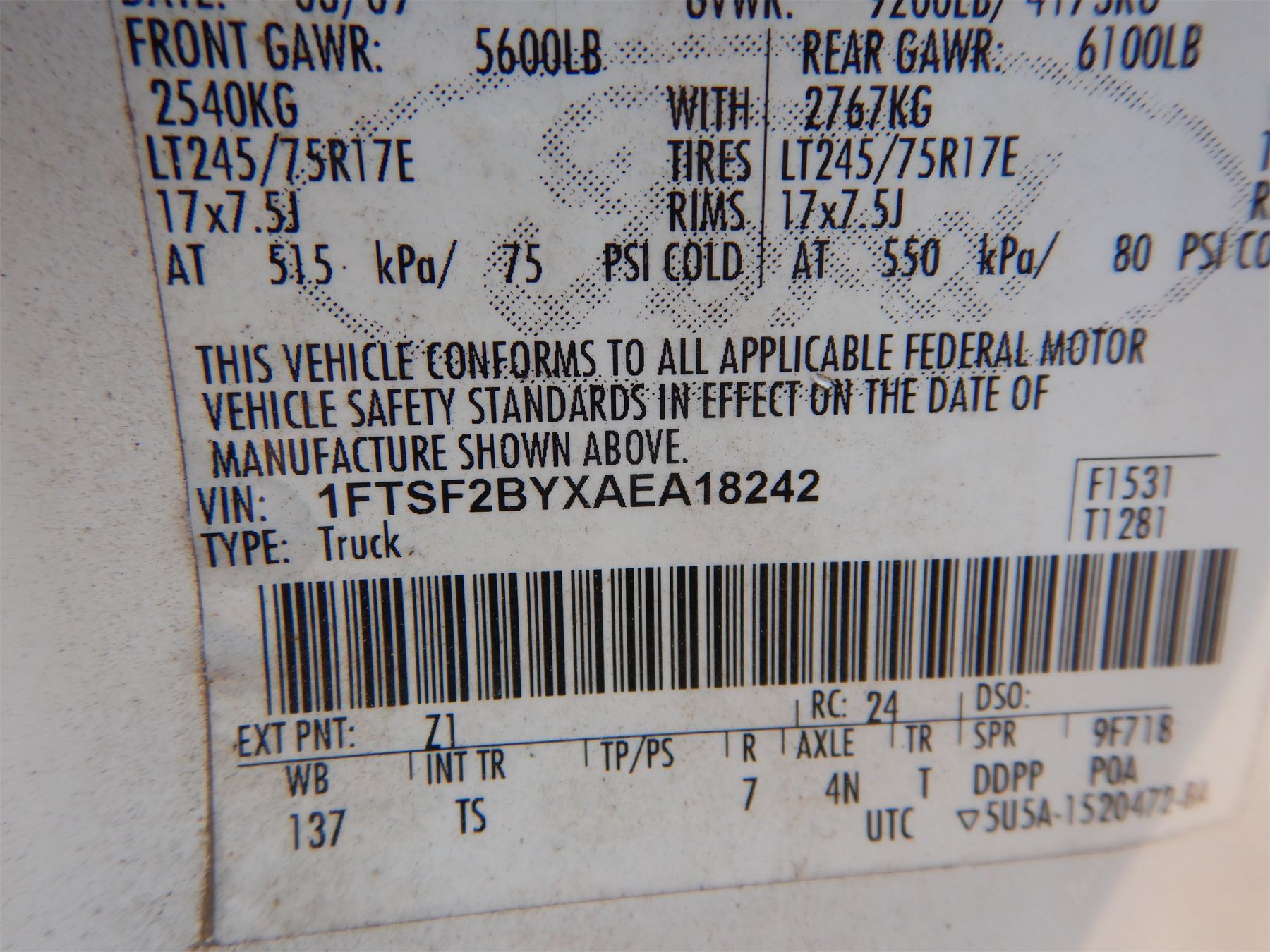 Vehicle ID Number: 1FTSF2BYXAEA18242