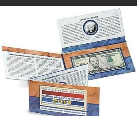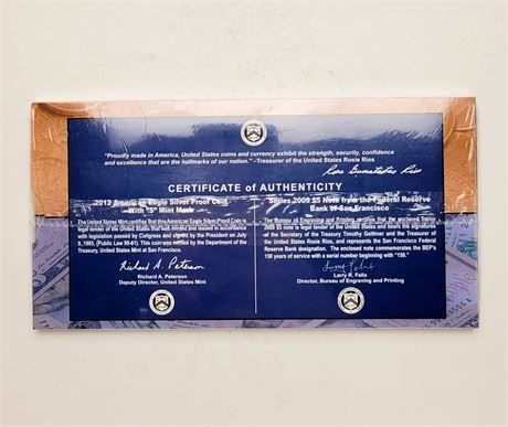 2012-SSilver Eagle Proof Coin and Series 2009 $5 Federal Reserve Bank of San Francisco Note