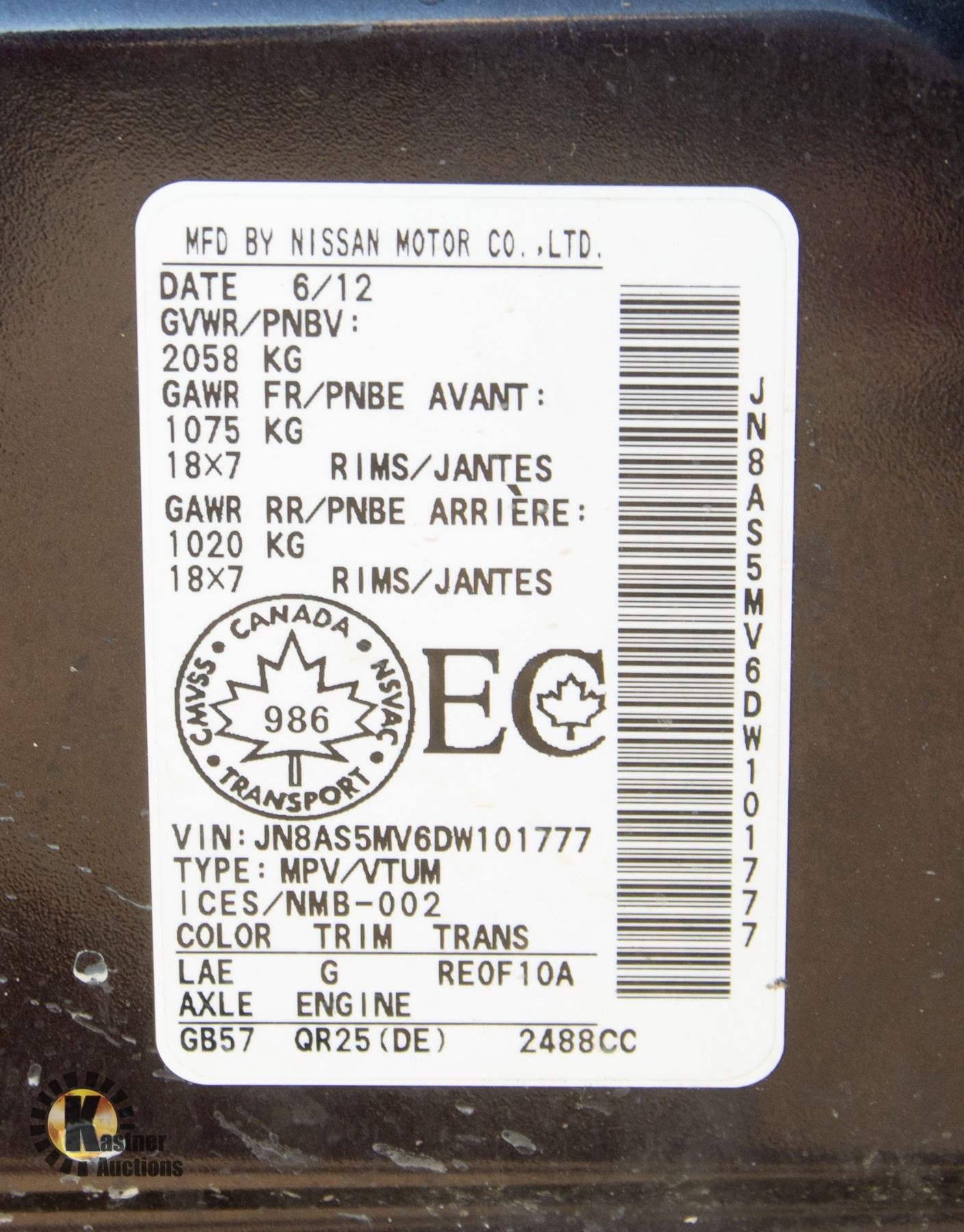 KM: 189,005KM VIN: JN8AS5MV6DW101777 Engine: 2.5L GASOLINE Color: MAROON FEATURES INCLUDE: CRUISE CONTROL, BACK-UP CAMERA, CD PLAYER, HEATED SEATS, POWER DOOR LOCKS, SUNROOF, AWD, LEATHER SEATS, POWER MIRRORS, AIR CONDITIONING, POWER WINDOWS. SERVICE IS DUE NOW (OIL CHANGE, FLUID CHANGES, ETC). LOW TIRE PRESSURE AND ONE FLAT REAR TIRE, LOW FUEL, MAINTENENCE TIRE PRESSURE SENSORS IS NEEDED, WINDSHIELD IS CRACKED, REAR WINDSHIELD WIPER IS BROKEN AND NOT FUNCTIONAL. REAR BUMPER IS CRACKED. ALL BIDS SUBJECT TO BANK, BAILIFF, OR OWNERS APPROVAL. ALL VEHICLES ARE SOLD AS IS. BUYERS PREMIUM IS 10% TO A MAX OF $750.00. KASTNER AUCTIONS DOES NOT PROVIDE MECHANICAL INSPECTIONS.