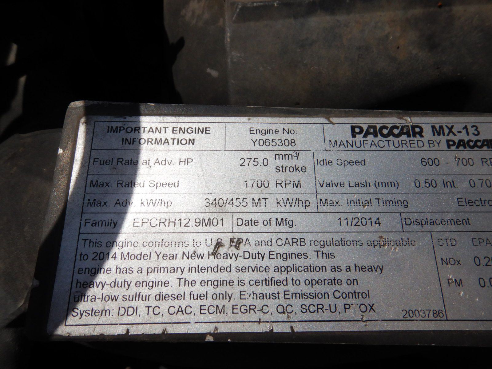 T/A, 455 HP Paccar MX-13 engine, 10 speed trans, 46K rears, air ride, 13,200 lb. front, 205" W/B, wet kit, alum headache rack, 11R24.5 tires, all alum