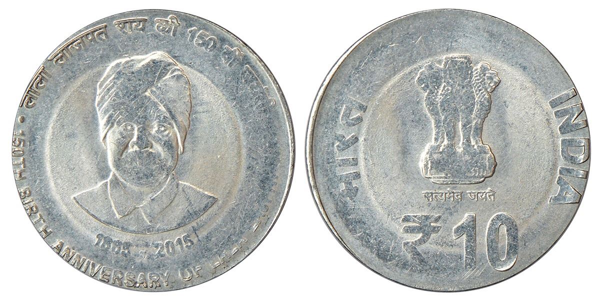 2015, Lala Lajpatrai, 10 rupees, Kolkata mint, struck on steel 2 rupees die instead of the usual bi-metal, off metal strike (OMS), 4.87g.