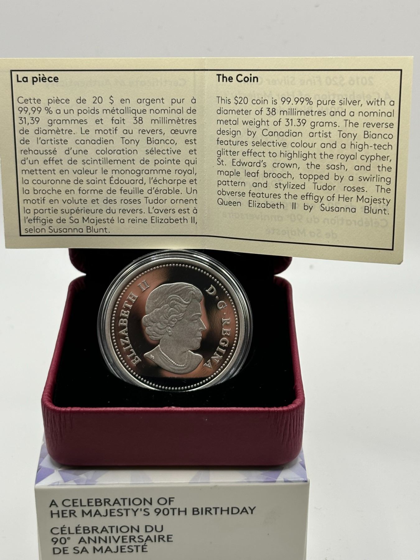 2016 $20 pure silver coin. Celebrating Her Majesty's 90th Birthday. (tax exempt)