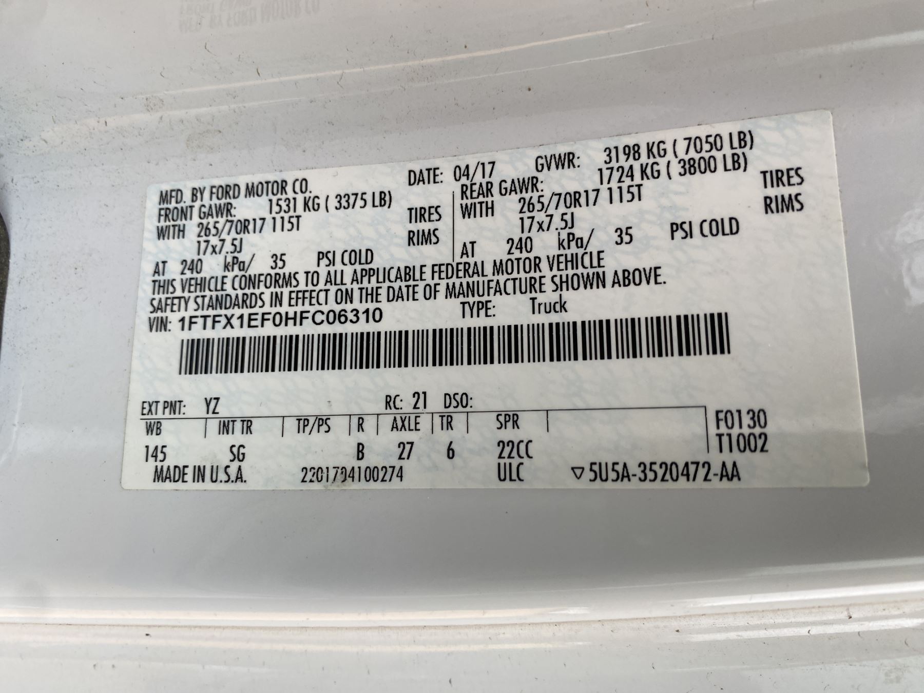 Vehicle ID Number: 1FTFX1EF0HFC06310