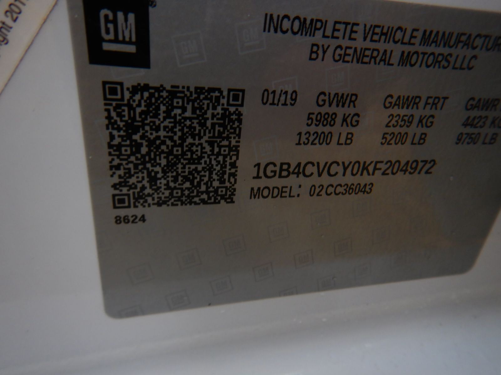 Vehicle ID Number: 1GB4CVCY0KF204972