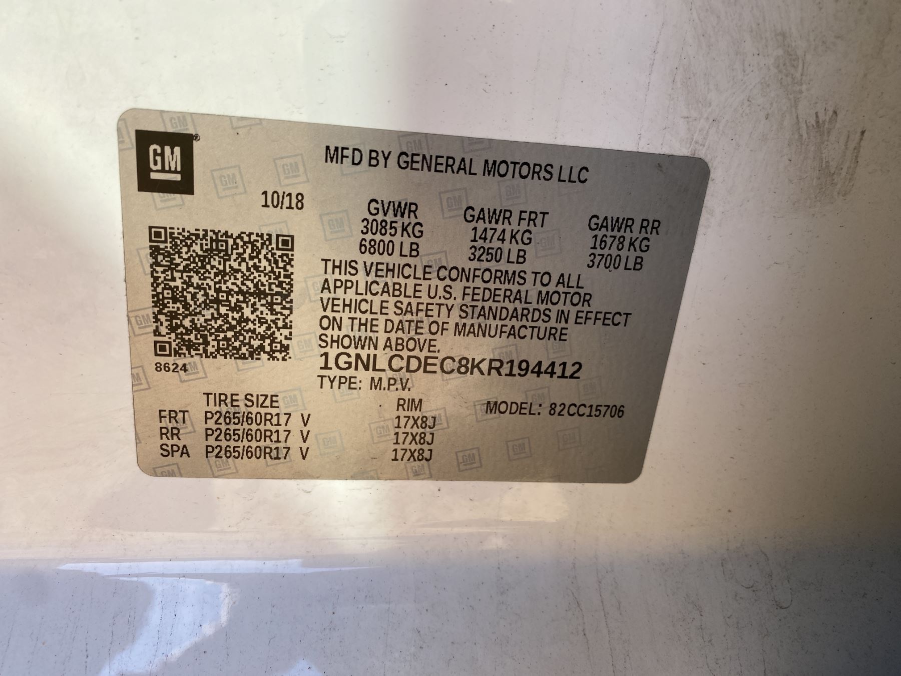 Vehicle ID Number: 1GNLCDEC8KR194412