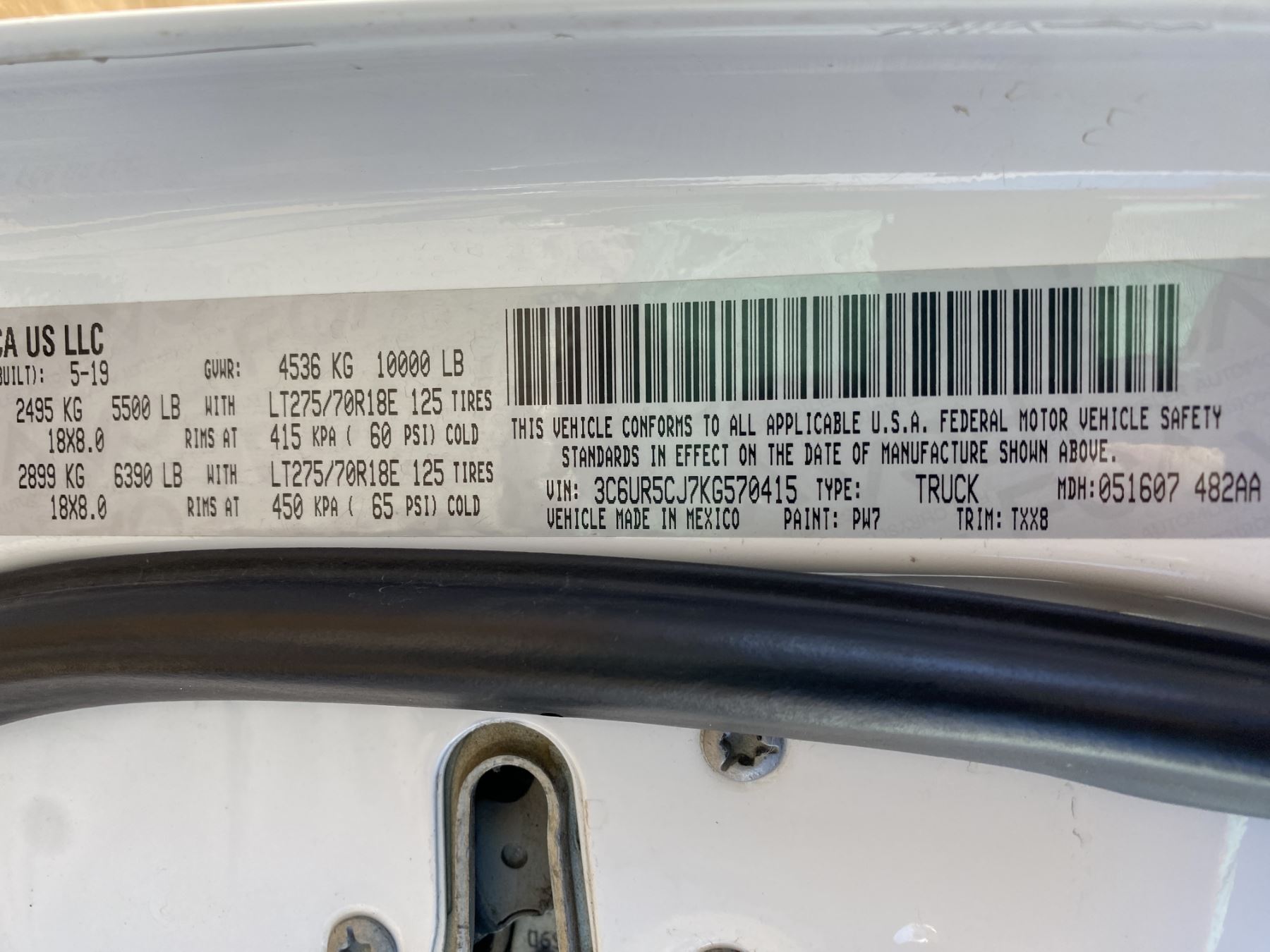 Vehicle ID Number: 3C6UR5CJ7KG570415