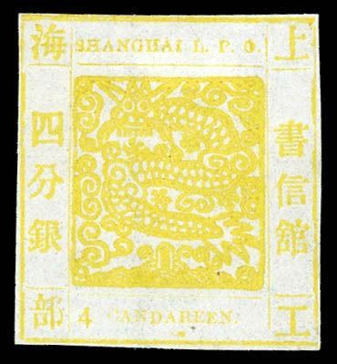 Chinese Local Posts: Shanghai, 1865, Large Dragon Antique Numerals, CANDAREEN singular, 4ca yellow, laid paper Chan LS10. Scott 10. Livingston 9, Printing 27, a splendid example of this difficult issue, wonderfully fresh with vibrant colors; tight margins as is usual with this printing, Very Fine, rare. Scott 3,000 HK 23,620.