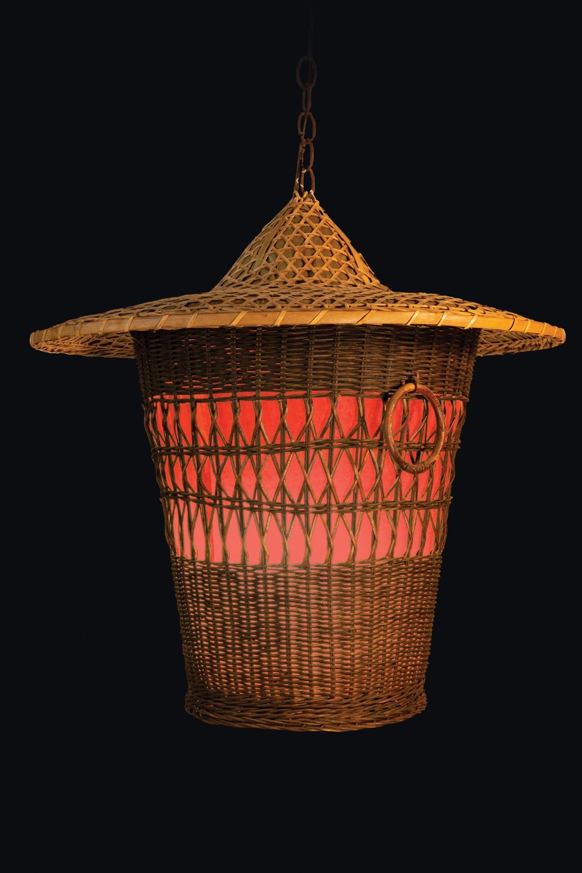 (1960s) Woven cane lamp lined with spun fiberglass paper. An OA classic. 24"x24". VG+ with typical wear.