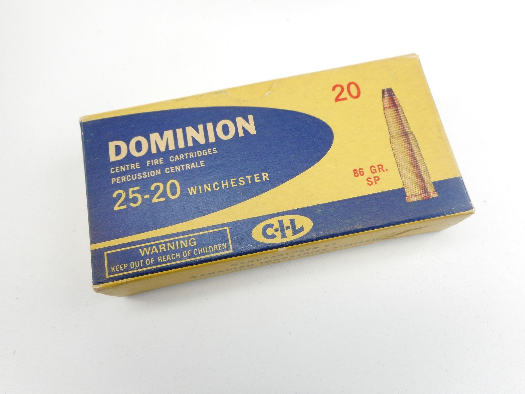 25-20 WINCHESTER AMMO , 20 RNDS 25-20 WINCHESTER AMMO, 85 GRSN SP., IN VINTAGE DOMINION BOX