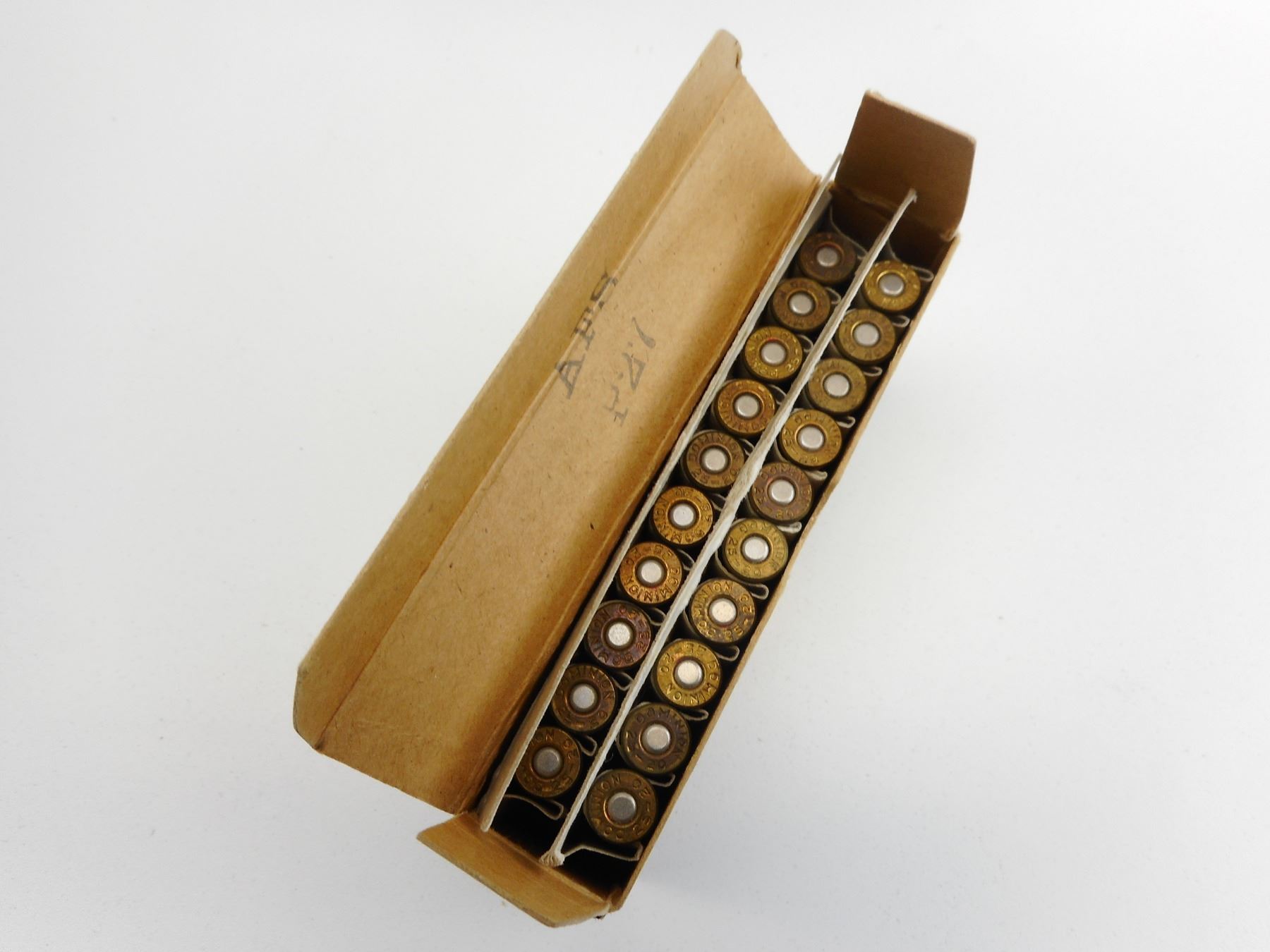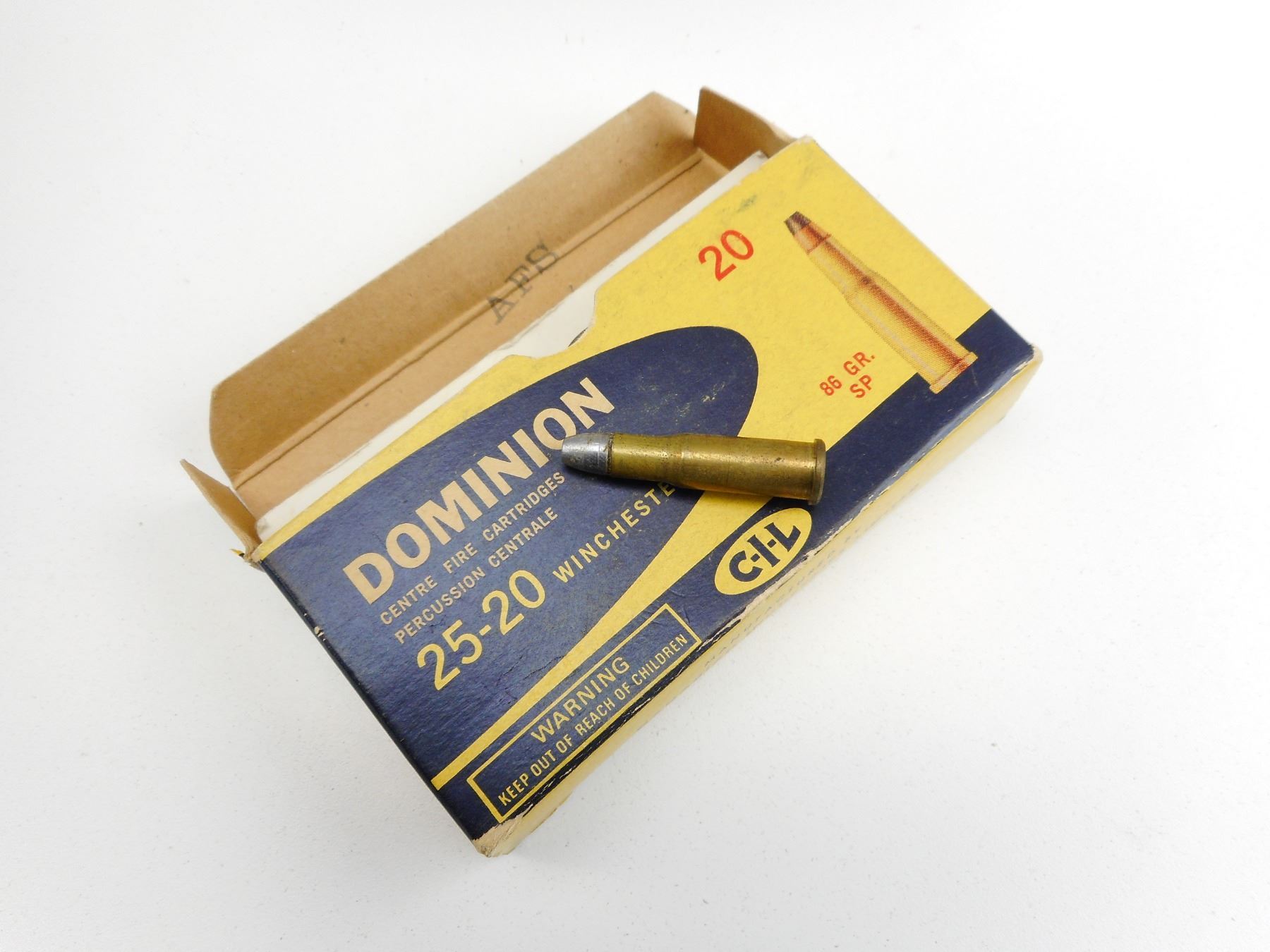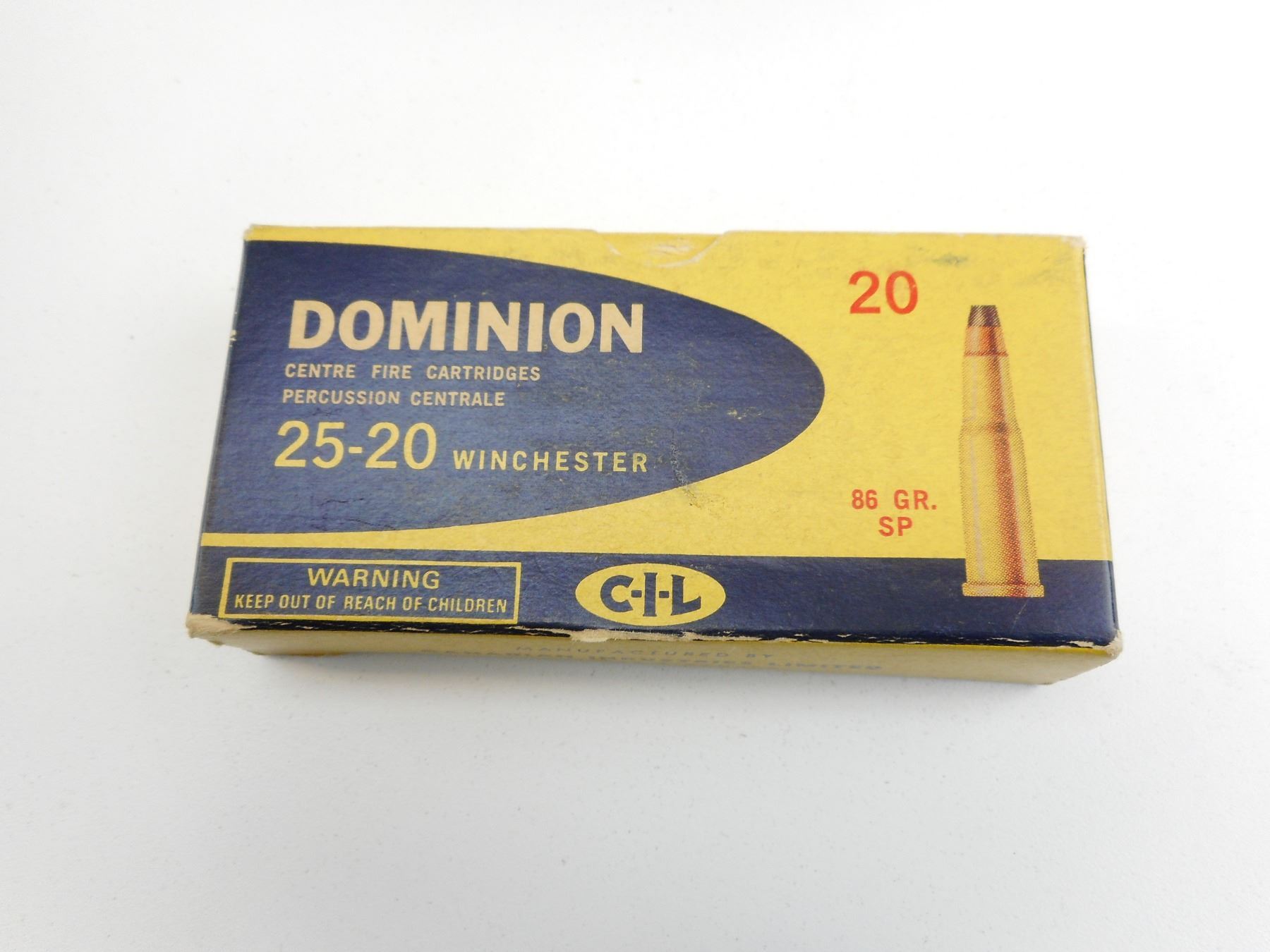 25-20 WINCHESTER AMMO , 20 RNDS 25-20 WINCHESTER AMMO, 85 GRSN SP., IN VINTAGE DOMINION BOX