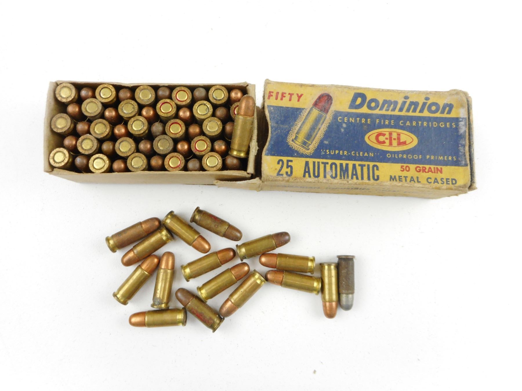 25 AUTOMATIC AMMO ASSORTED , 66 RNDS 25 AUTOMATIC SOME IN VINTAGE DOMINION BOX